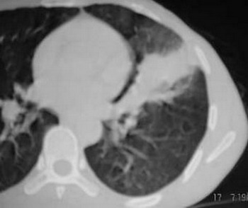 左肺舌叶大片影,支气管通入,但有纠集,边界不清,与侧壁胸膜广基相续,首先考虑感染性病变.血象与血沉及痰检.除外有结核可能