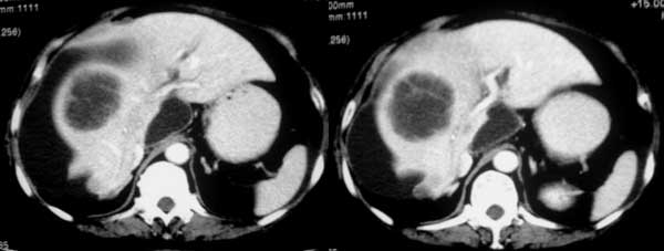 两次片比较(间隔三个月)胆囊窝肝内低密度灶增大,内部有分隔,周围有环形强化,肝内出现囊样低密度影,边界清,肝门部有囊样低密度影,肝左叶胆管扩张,胆总管稍扩张,胆囊体积大,壁不均匀增厚。