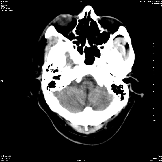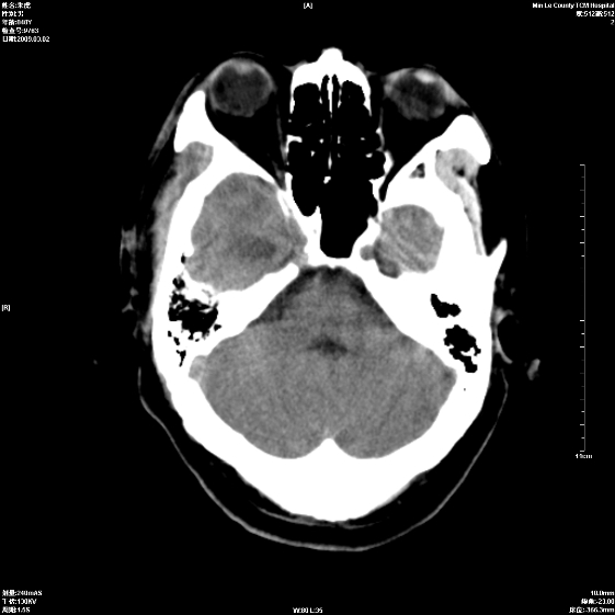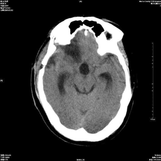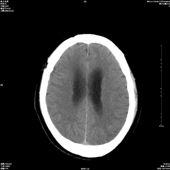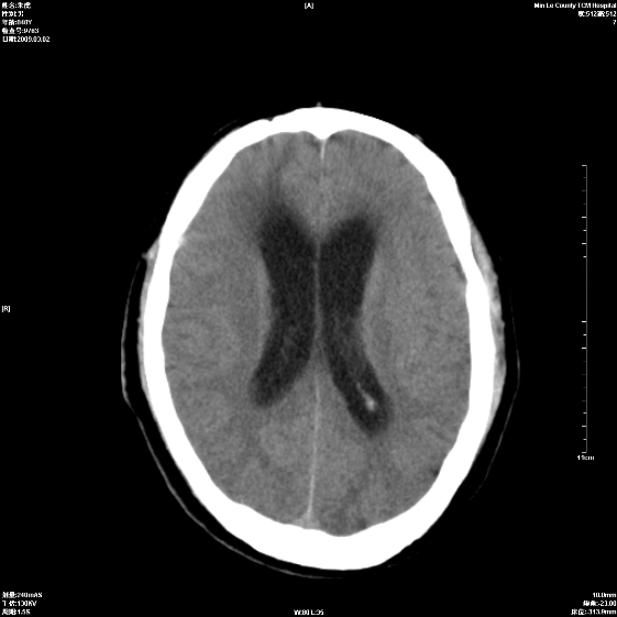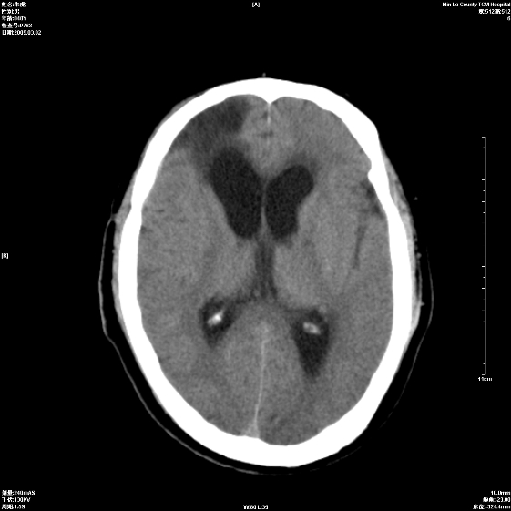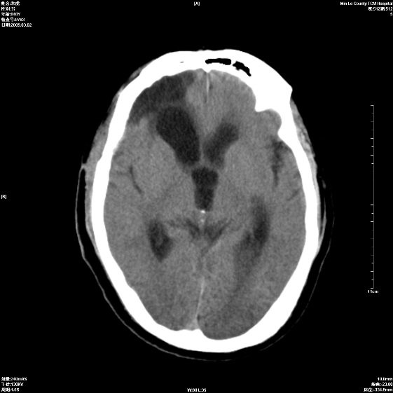 [br]右侧额叶局软化灶,梗阻性脑积水。