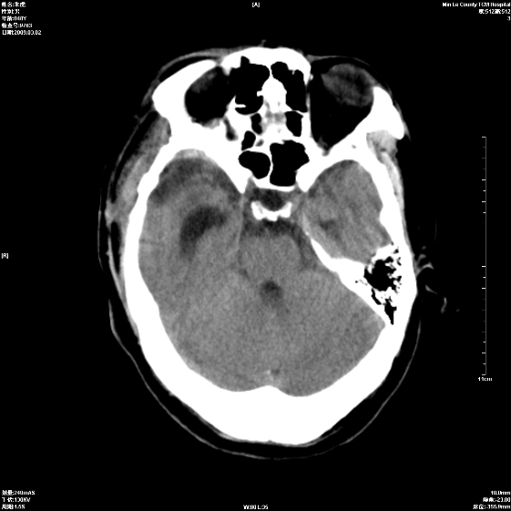 1)右侧额颞部颅骨术后改变。2)右侧额颞叶脑软化灶。3)脑积水(梗阻性)。