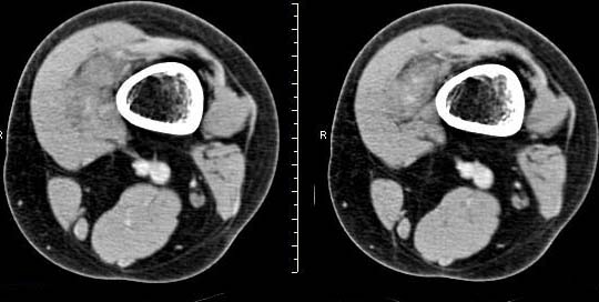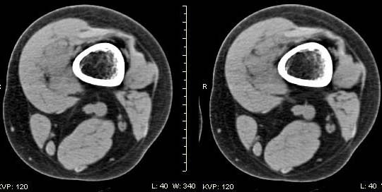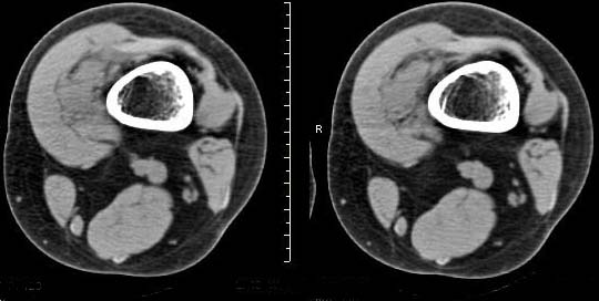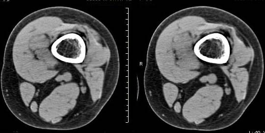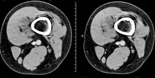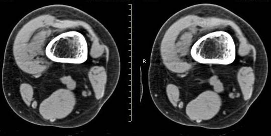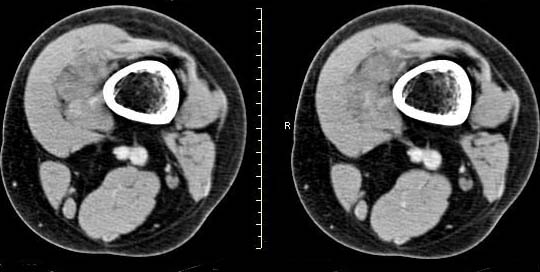以下是引用随光逐影在2009-3-5 19:55:00的发言:[br]考虑左大腿下部内侧肌源性恶性肿瘤(恶性纤维组织细胞瘤?)。