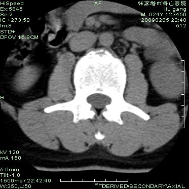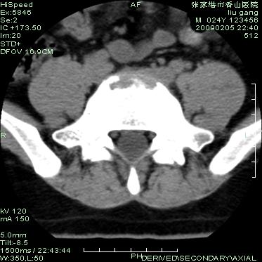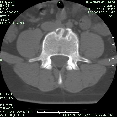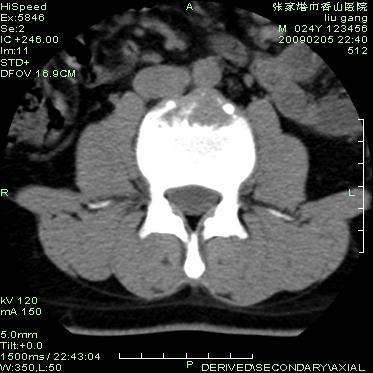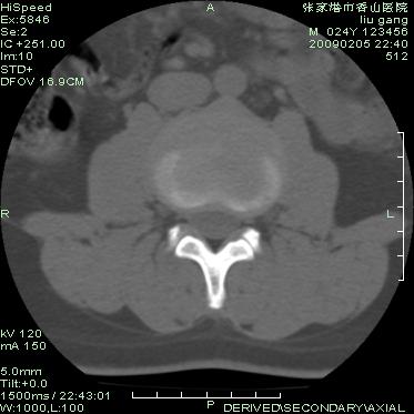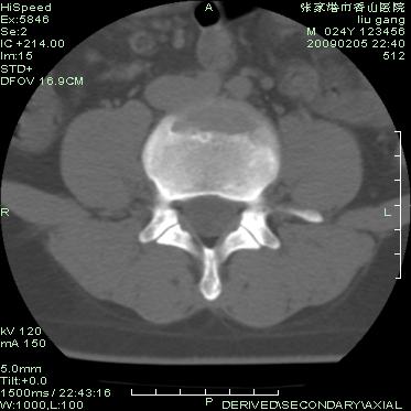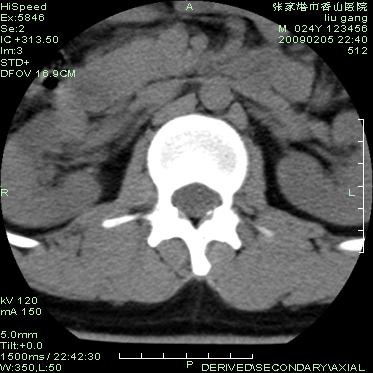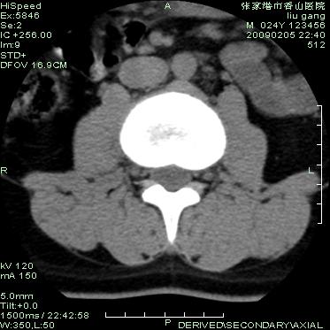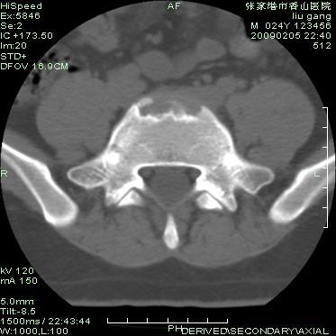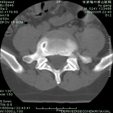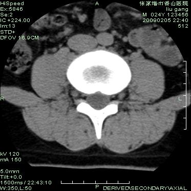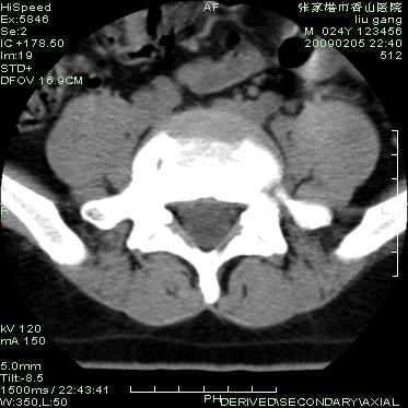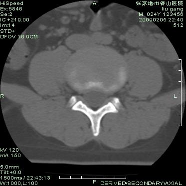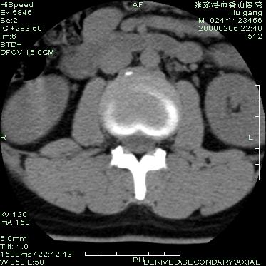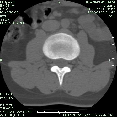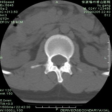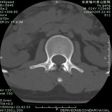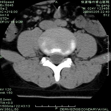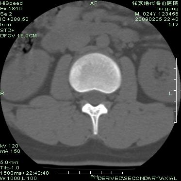 以下是引用随光逐影在2009-3-11 14:43:00的发言:[br]平片:l3、4、5及s1前上缘见类似“切角征”。[br]ct扫描:腰椎多个节段椎间盘向椎体内(椎体前部)突出。