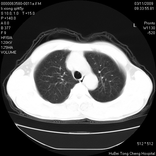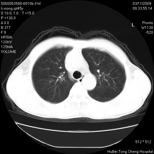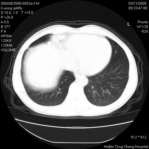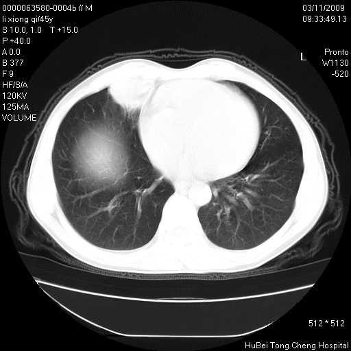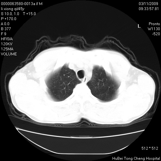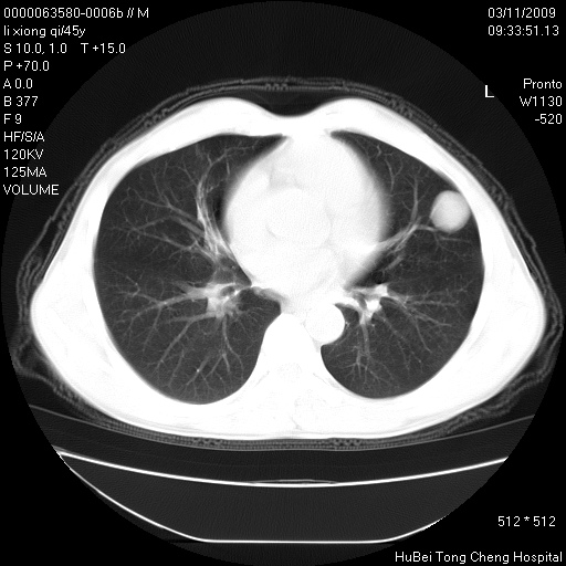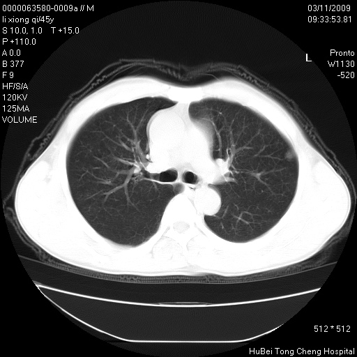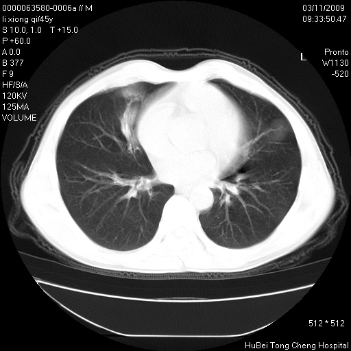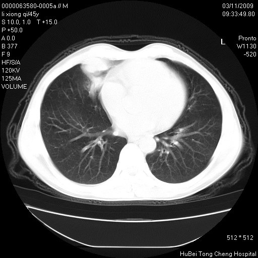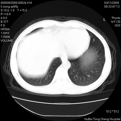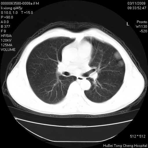 CT18634:M,45Y。胸痛,咳嗽伴痰中带血1月余。