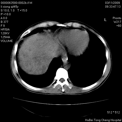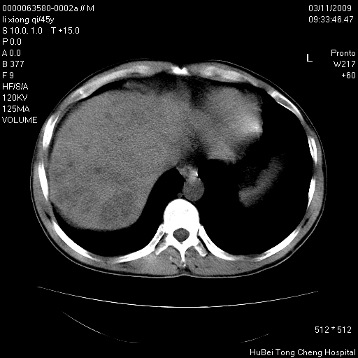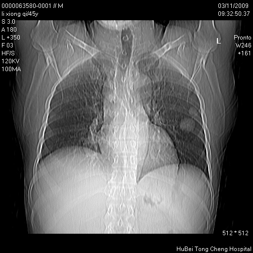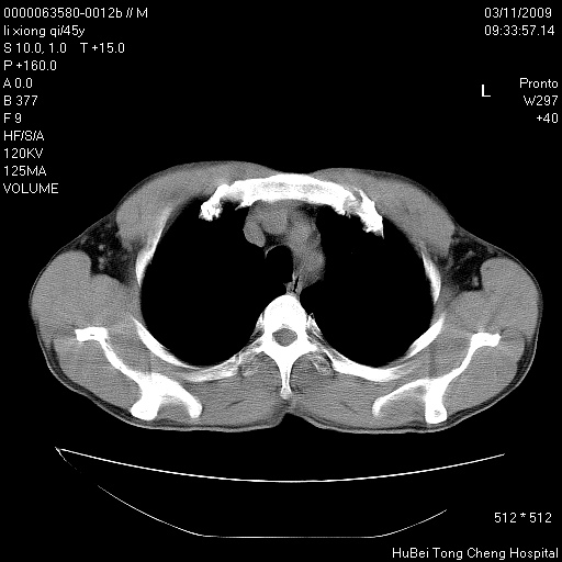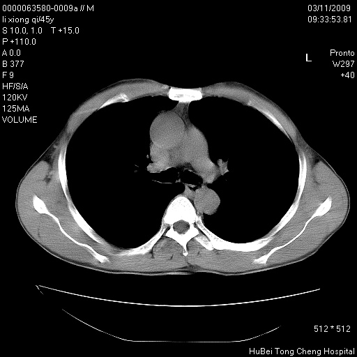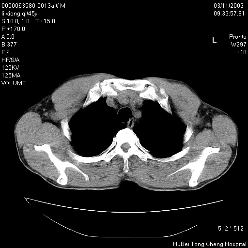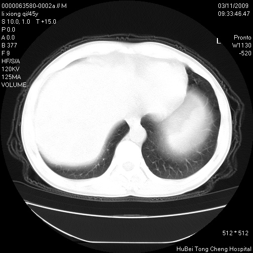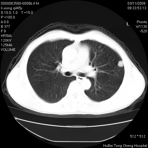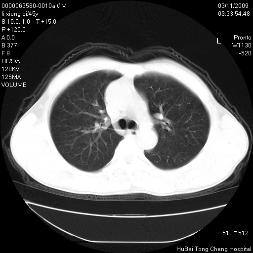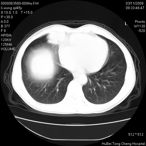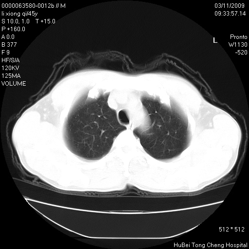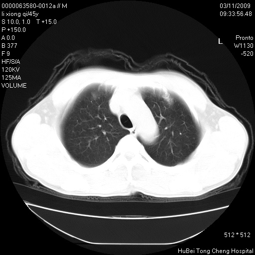 CT18634:M,45Y。胸痛,咳嗽伴痰中带血1月余。