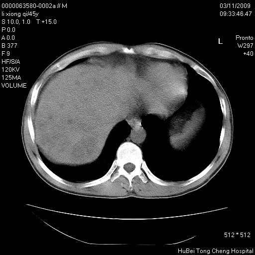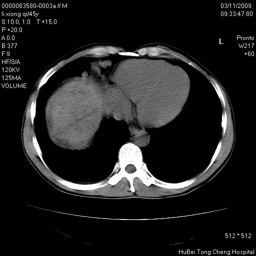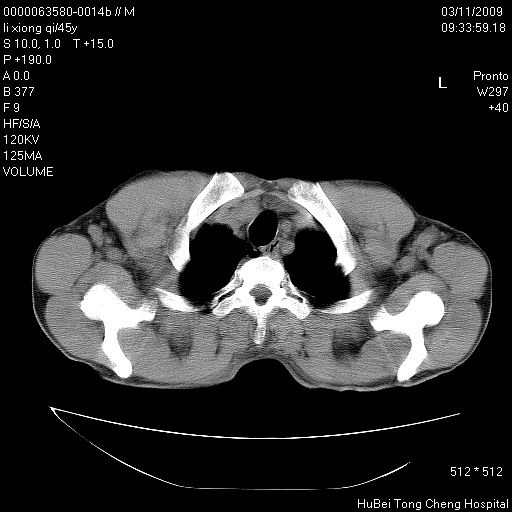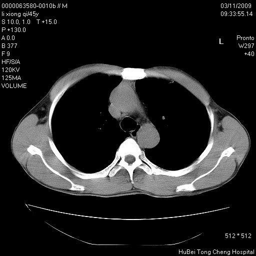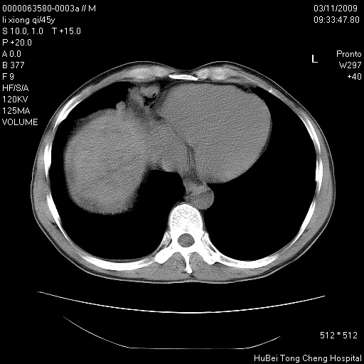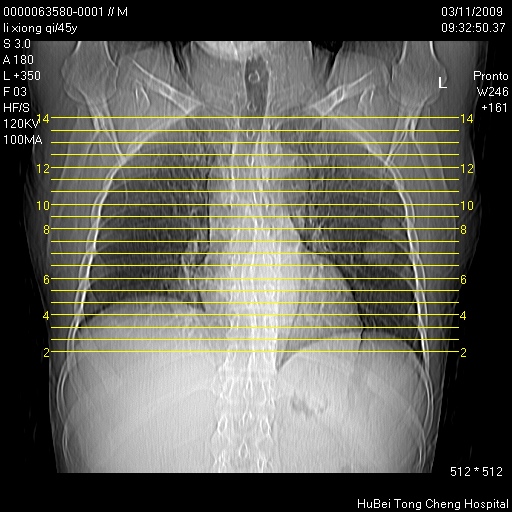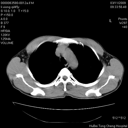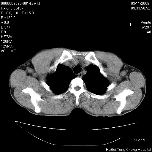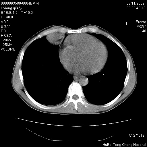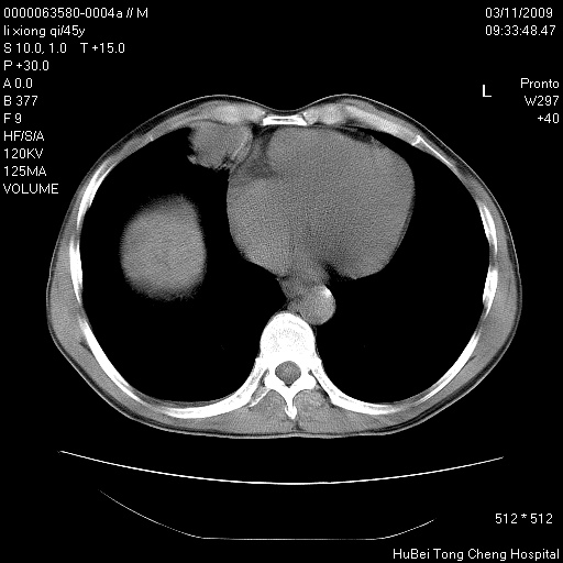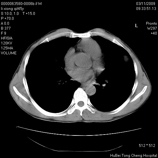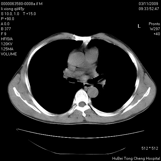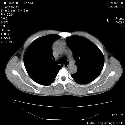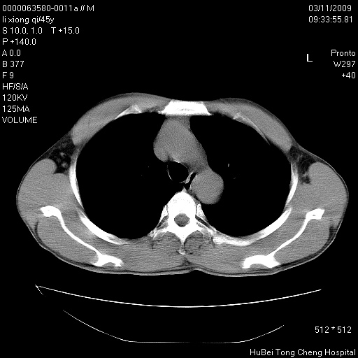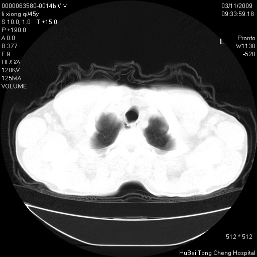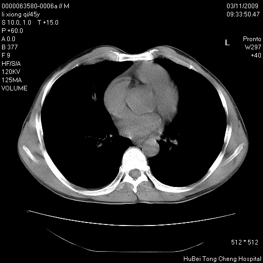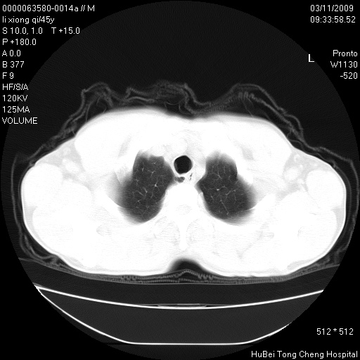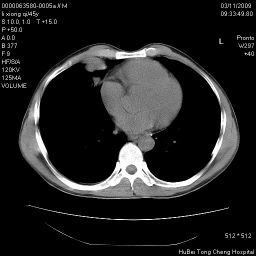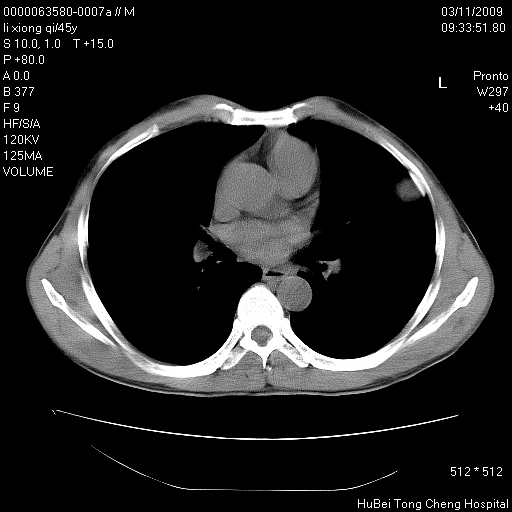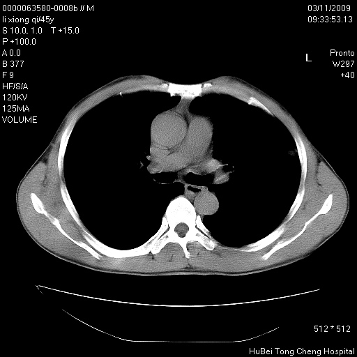 胸部ct轴位平扫(层厚10mm,螺距1.5,重建间隔10mm),图像如下: