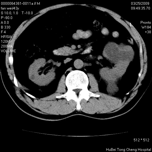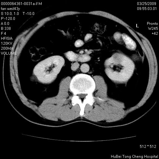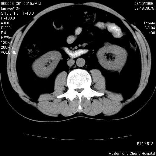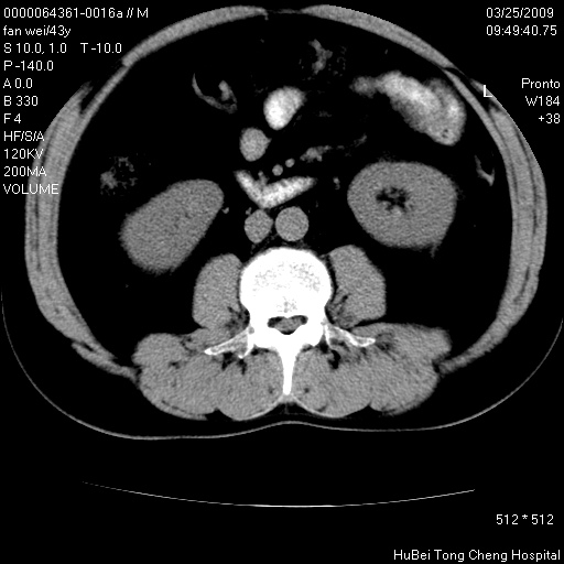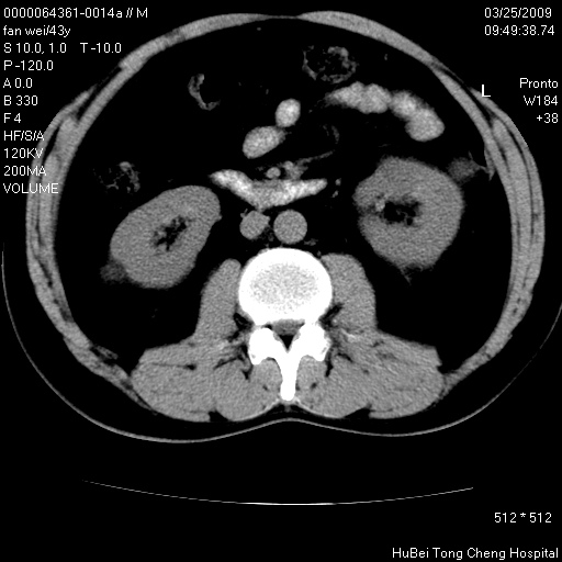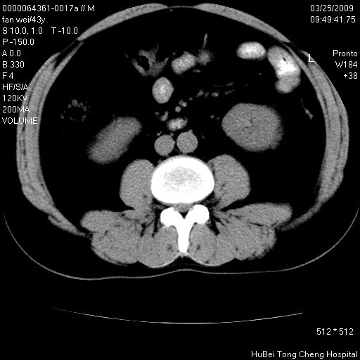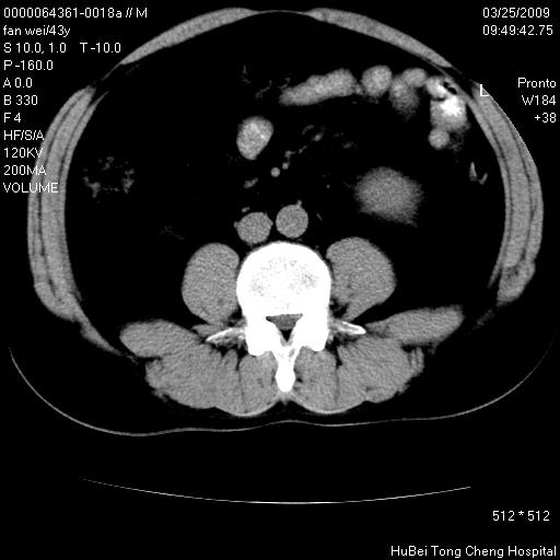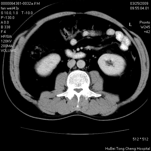 患者 男,43岁。左侧腰部不适两天。平素健康。无家族遗传病史。