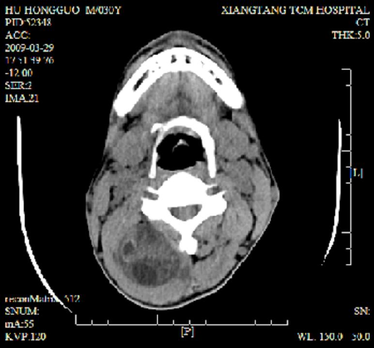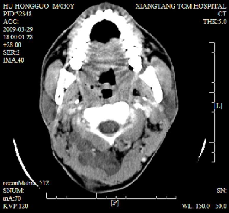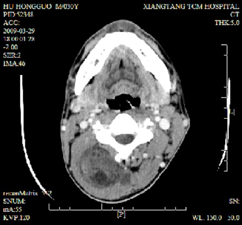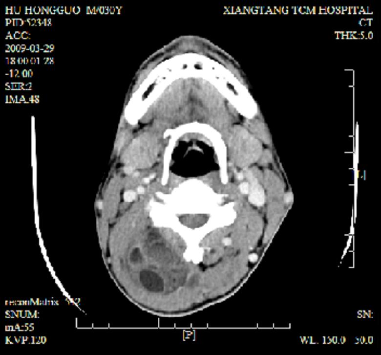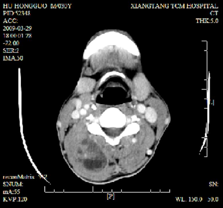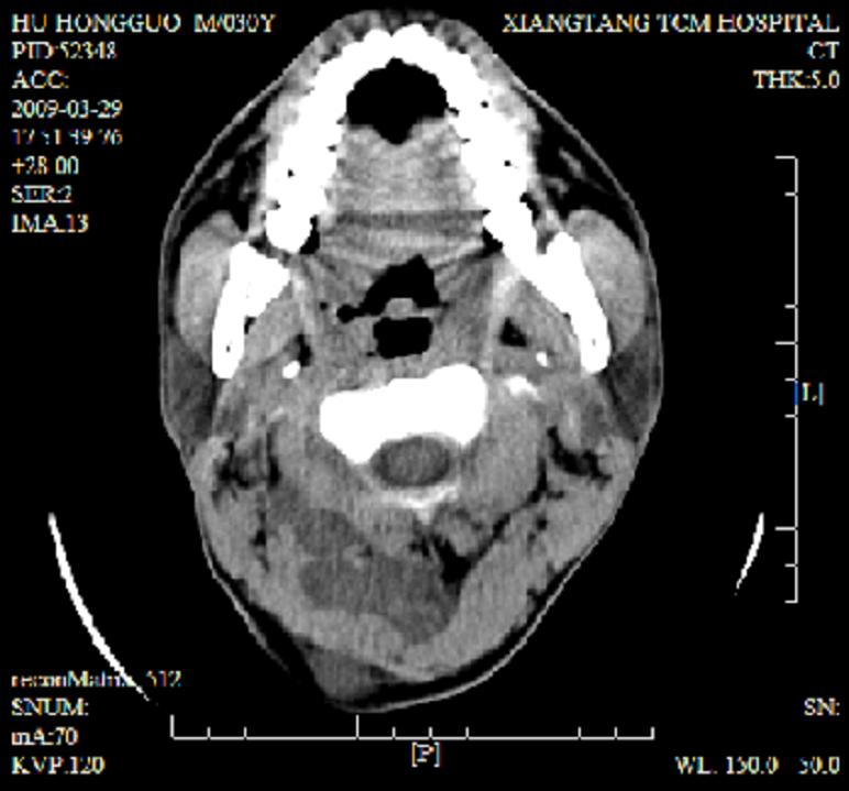 右侧椎前间隙后部肌间、皮下囊性为主病变,可见分隔和点状钙化,分隔和壁呈轻度环形强化,大部分无强化。形态不规则,有钻缝特点。考虑1 淋巴管瘤合并感染2 血管平滑肌脂肪瘤3 表皮样囊肿4 不除外海绵状血管瘤。