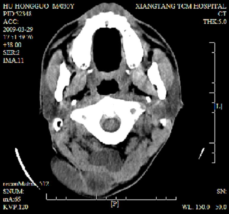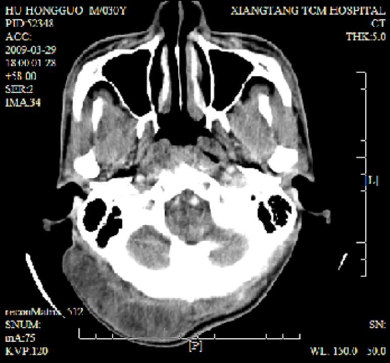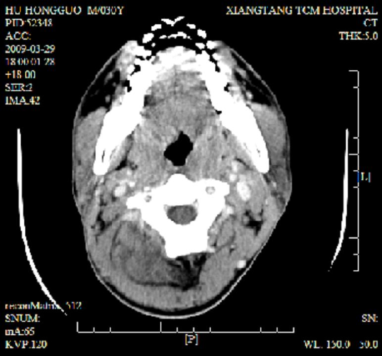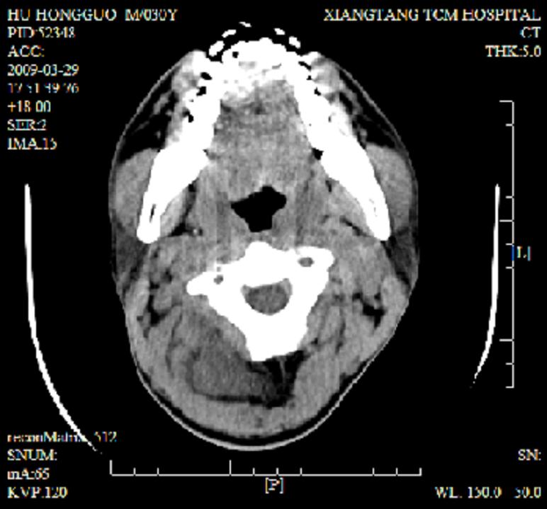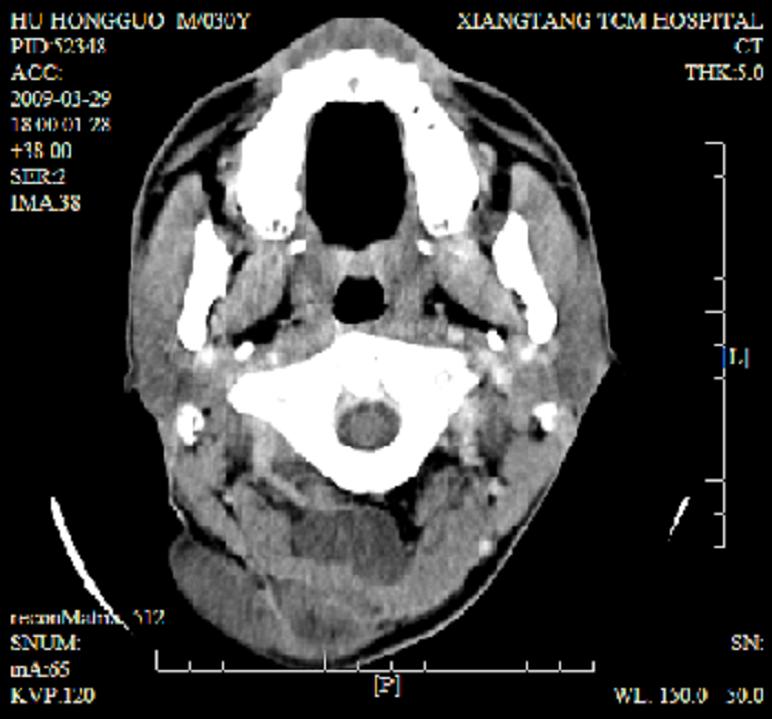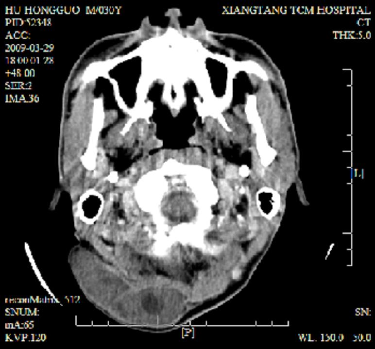 右侧椎前间隙后部肌间、皮下囊性为主病变,可见分隔和点状钙化,分隔和壁呈轻度环形强化,大部分无强化。形态不规则,有钻缝特点。考虑1 淋巴管瘤合并感染2 血管平滑肌脂肪瘤3 表皮样囊肿4 不除外海绵状血管瘤。