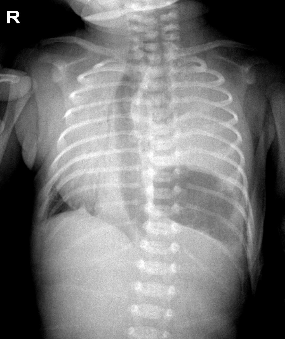 以下是引用余辉在2009-4-1 16:36:00的发言:[br]第一眼看起来是白肺,双侧支气管气像,考虑新生儿肺透明膜病,但是纵隔向右侧移位了,为什么移位,左侧压力较高或者右侧压力低,但是双侧肺都是白的,而且右侧膈角区有边缘清楚的肺膨胀区,这样又不太像透明膜病,患者胃泡膨胀且位置上升,考虑左侧先天性膈疝伴左肺不张,纵隔右移,右肺爱压,建议ct检查,不排消化道亦有畸形