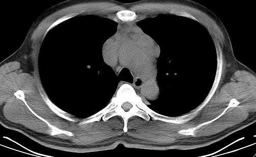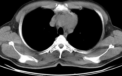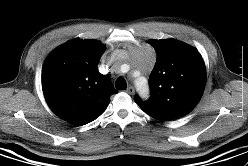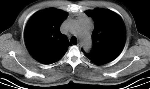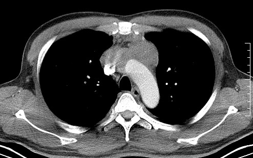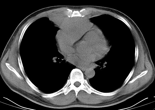 上区却那么有点象占位,胸腺瘤不太象,一点强化也没有,淋巴瘤气管前上腔静后却很干净,下区也点象纵隔积血征,