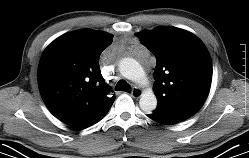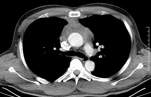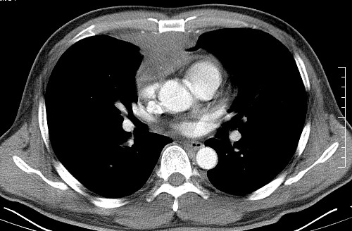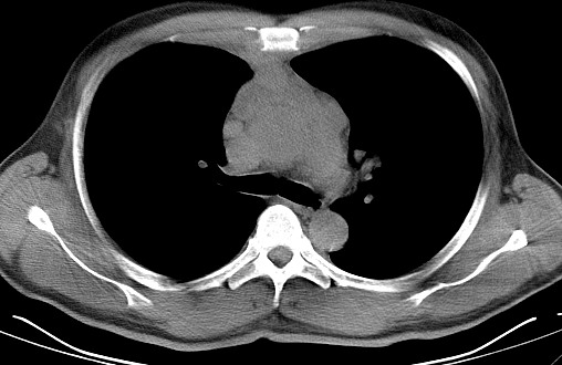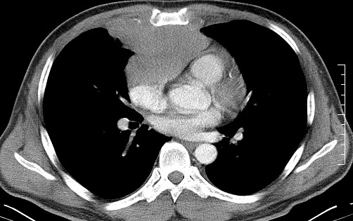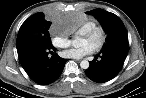 考虑:1)淋巴瘤。2)不排除侵袭性胸腺瘤。