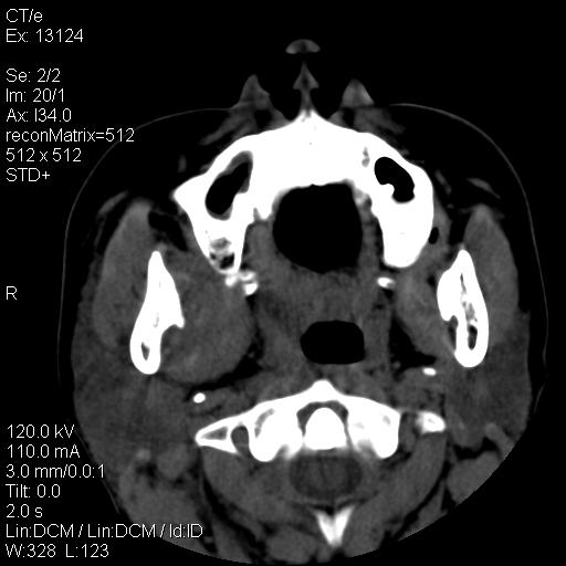 考虑----扁桃体炎症并脓肿形成及周围唾液腺-咽部-右上颌窦炎症,抗炎后复查。