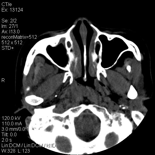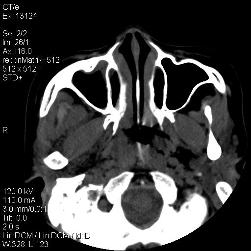 1)考虑右侧下颌区软组织脓肿(牙源性)。2)鼻咽部炎性改变;建议追踪复查。3)右侧上颌窦炎。4)双侧下鼻甲黏膜肥厚。