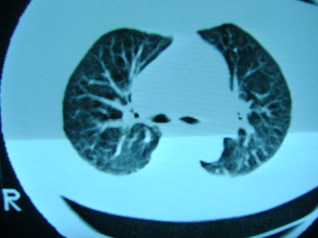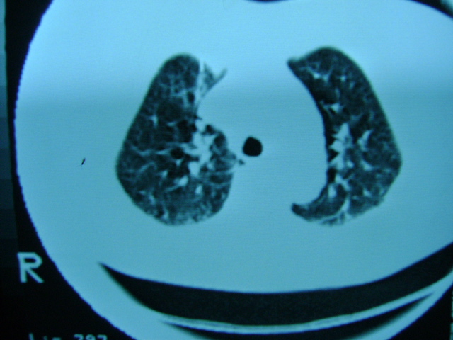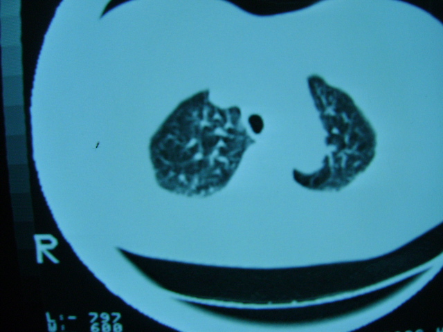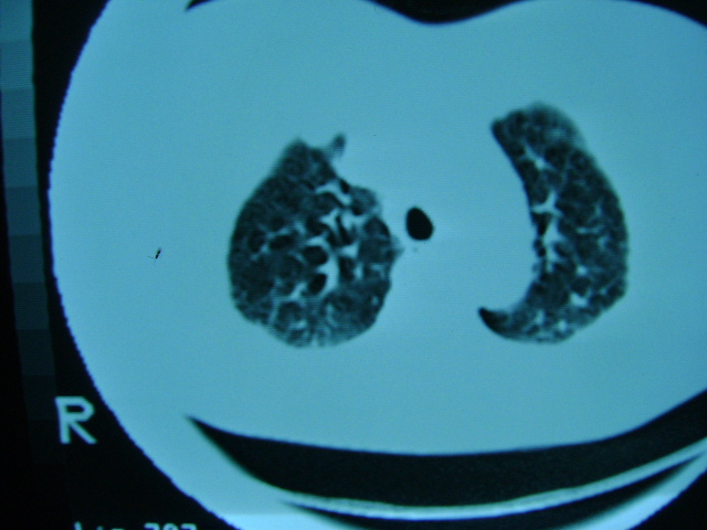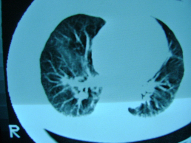 左肺门未见异常‘右肺有少许感染,图象质量不好