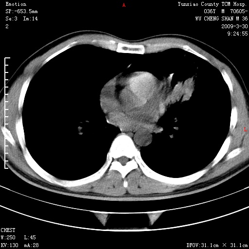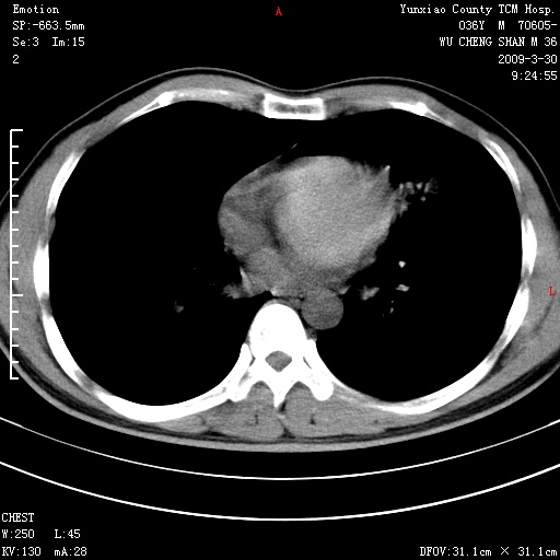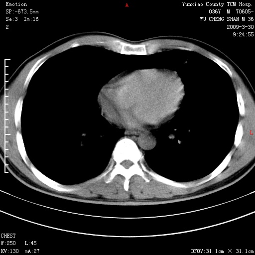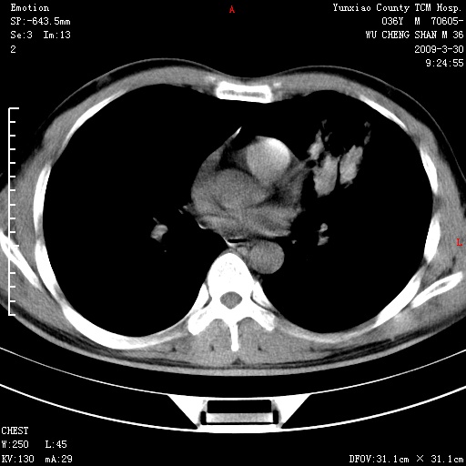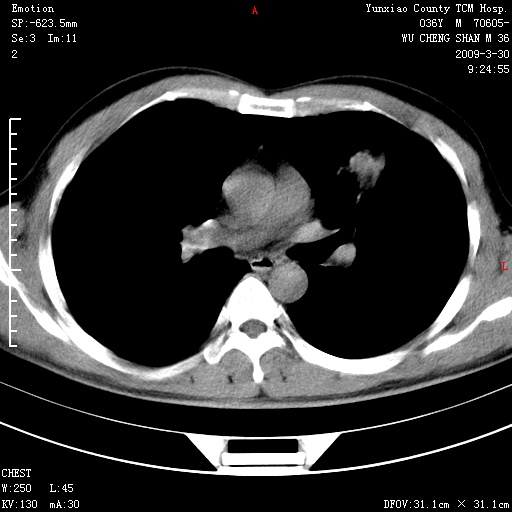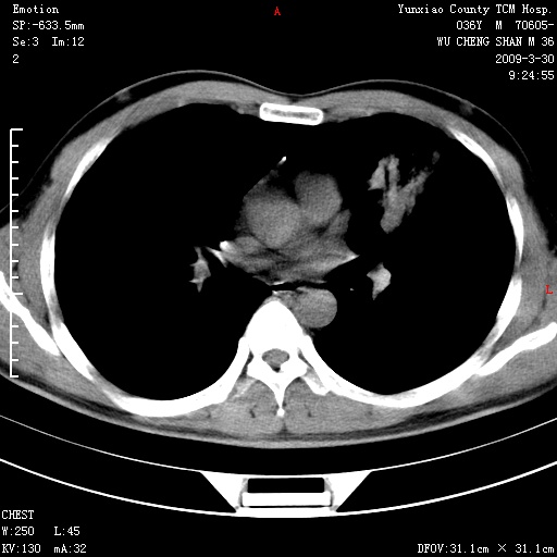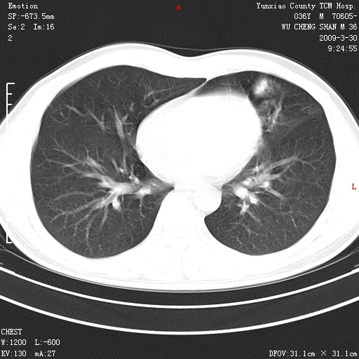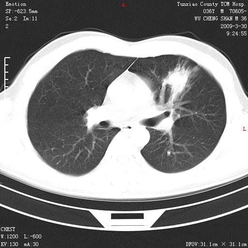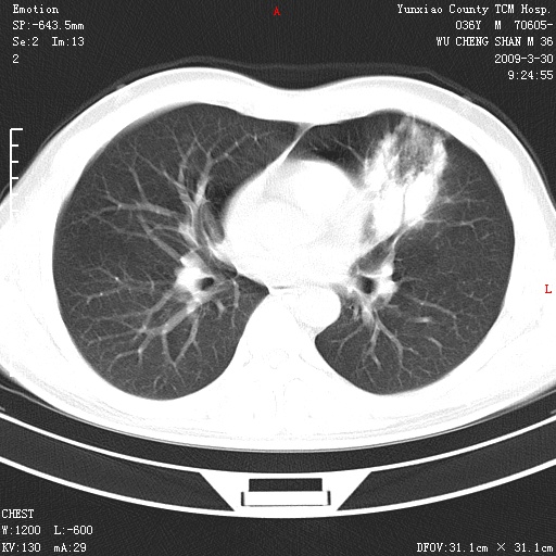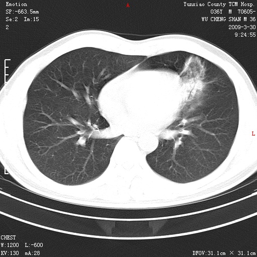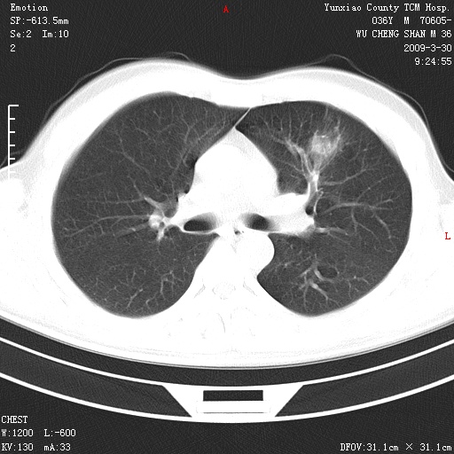 本院家属,胸痛,无咳嗽咳痰发烧病史,治疗一个月后病灶无明显改变,支气管镜示左肺慢性炎症,未见癌细胞,