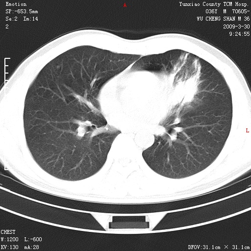 左肺舌叶片状影,边缘不清,内见空支气管征,炎性病变