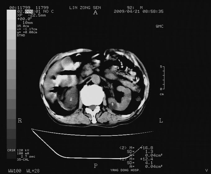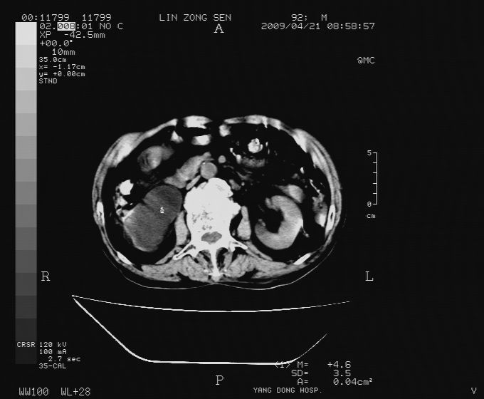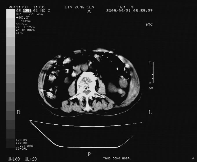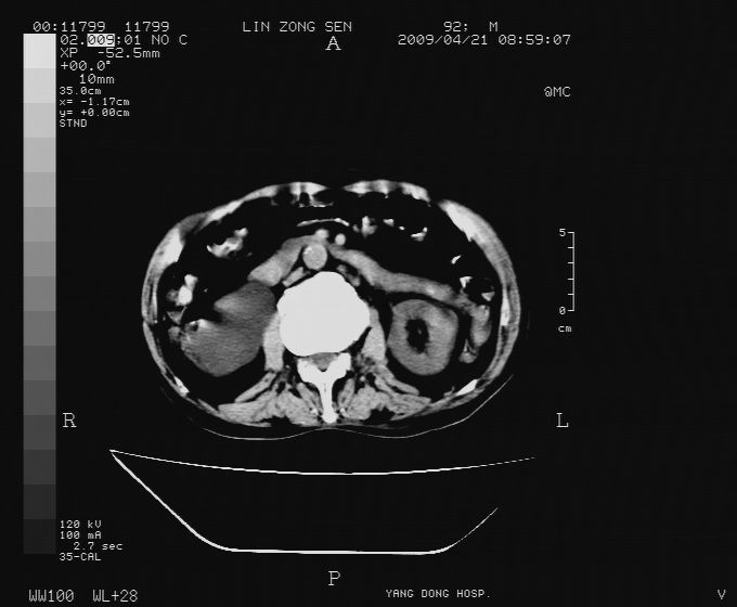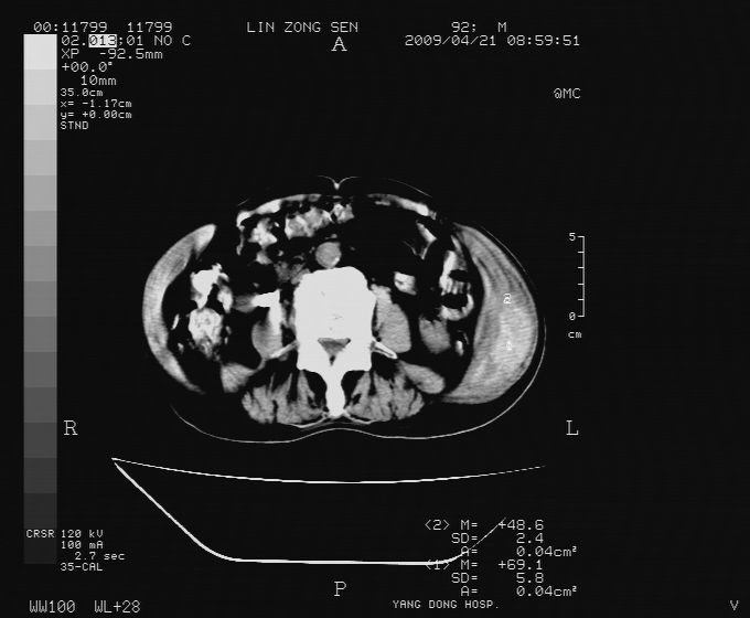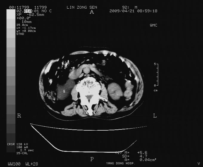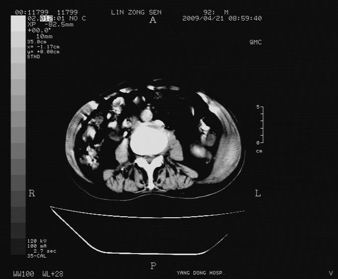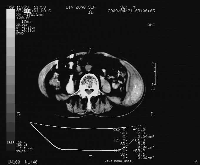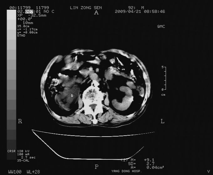 以下是引用卜一在2009-4-22 4:08:00的发言:[br]右肾积水伴输尿管上段积水!左侧肾多发囊肿!左侧腹壁软组织增厚,层次模糊,内密度较高—不排除血管瘤伴出血!
