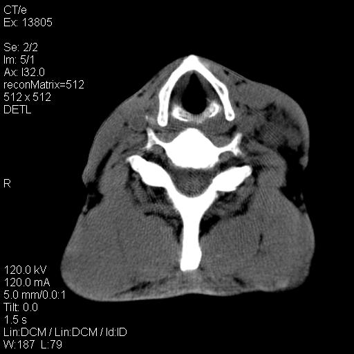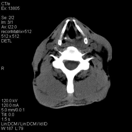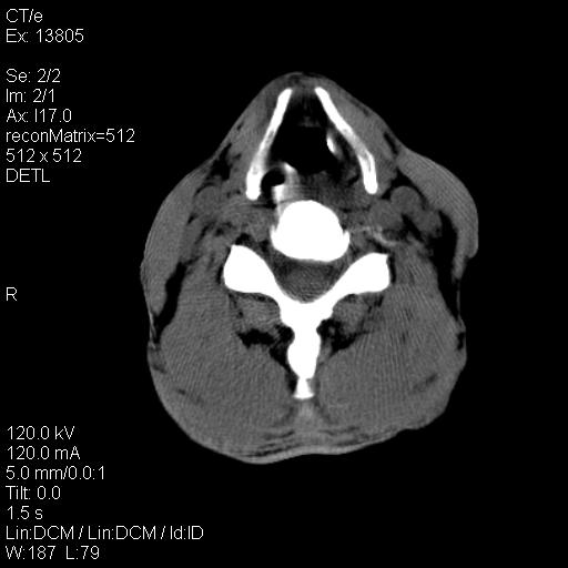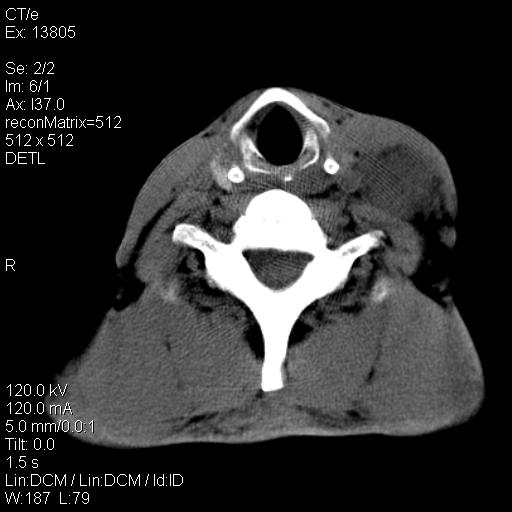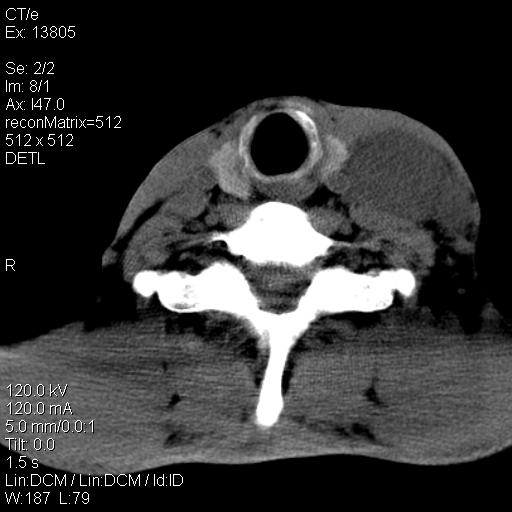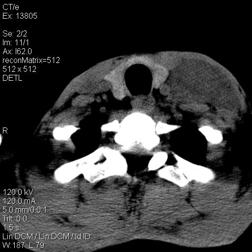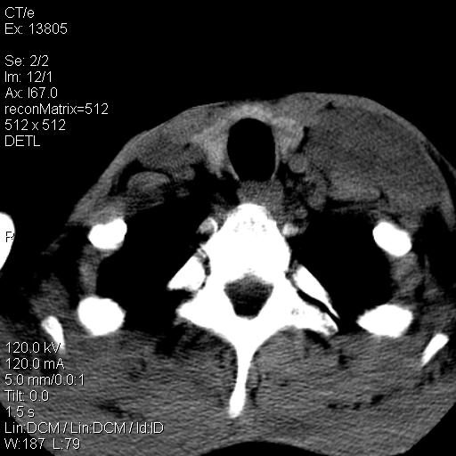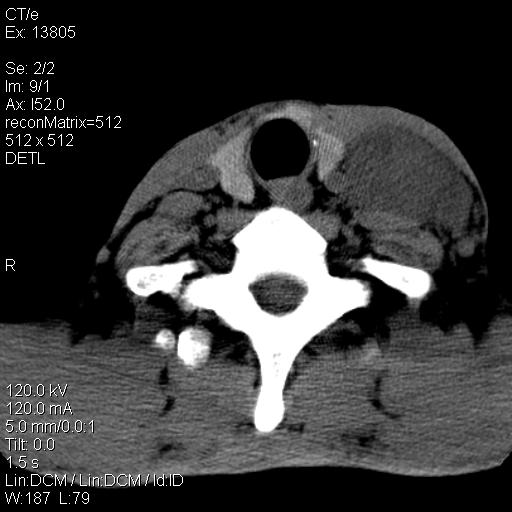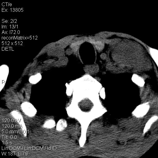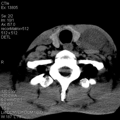 左侧胸锁乳突肌下方、颈血管旁低密度肿块影,肿块密度尚均匀,边缘大部分清楚,邻近组织稍受压移位。考虑颈部神经鞘瘤可能性大。