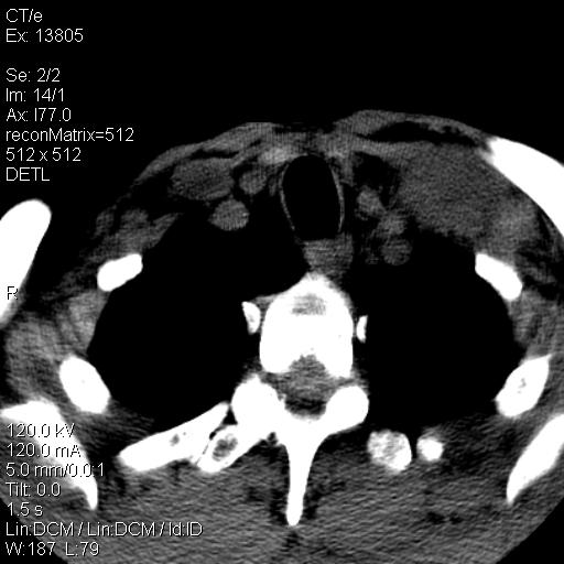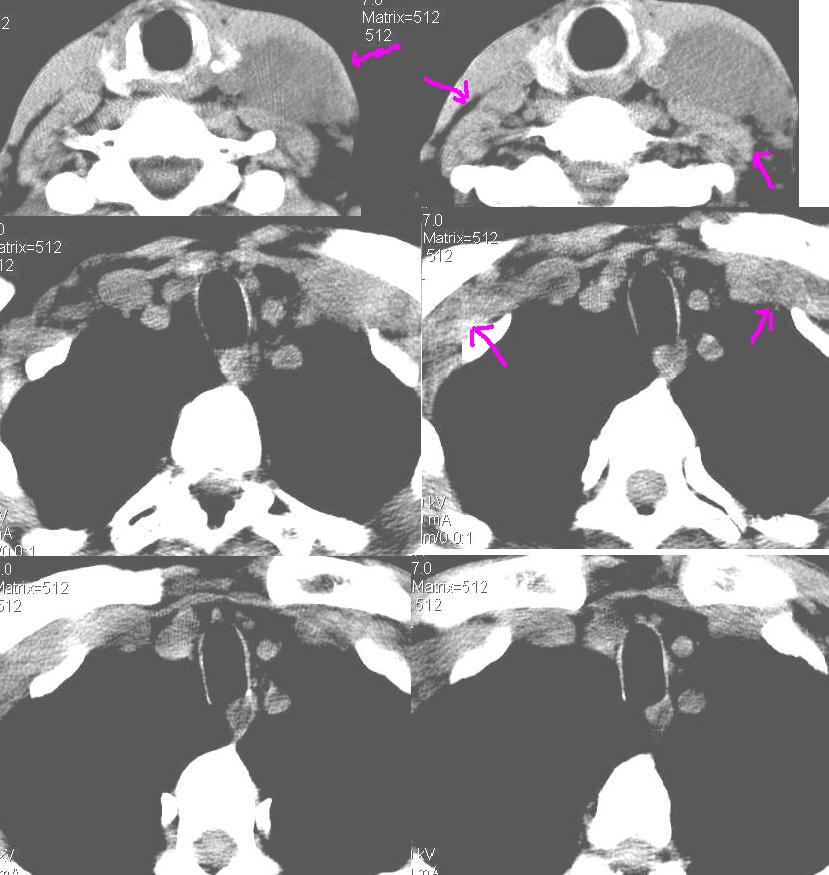 上腹部疼痛一月,呕吐10天,发现左侧颈部包快10天 胸部cr片未见明显异常。