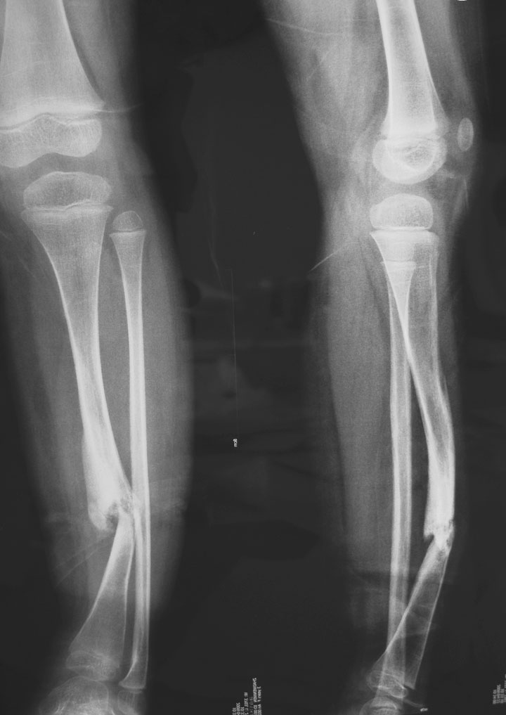 以下是引用jiangjing在2009-4-25 11:14:00的发言:[br]胫骨中下三分之一交界区骨结构不连续,断端成角,骨质硬化,结合病史支持先天性胫骨假关节