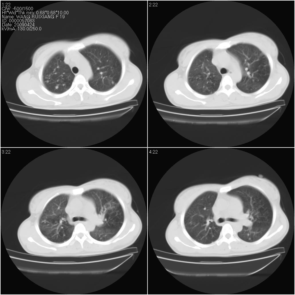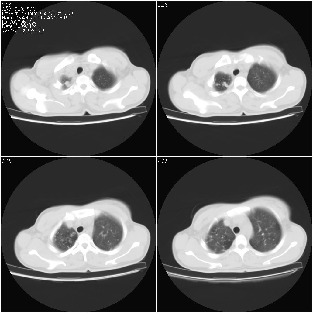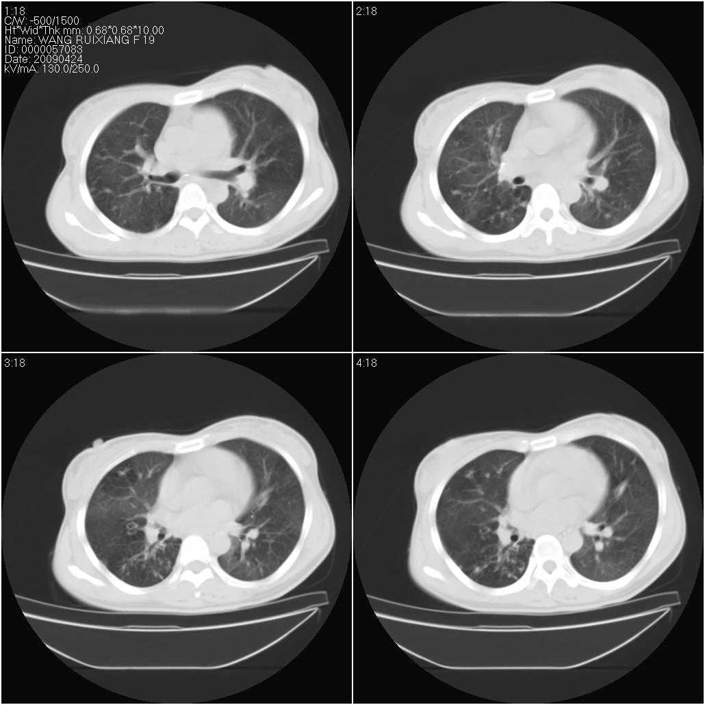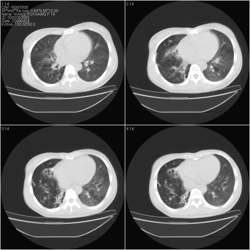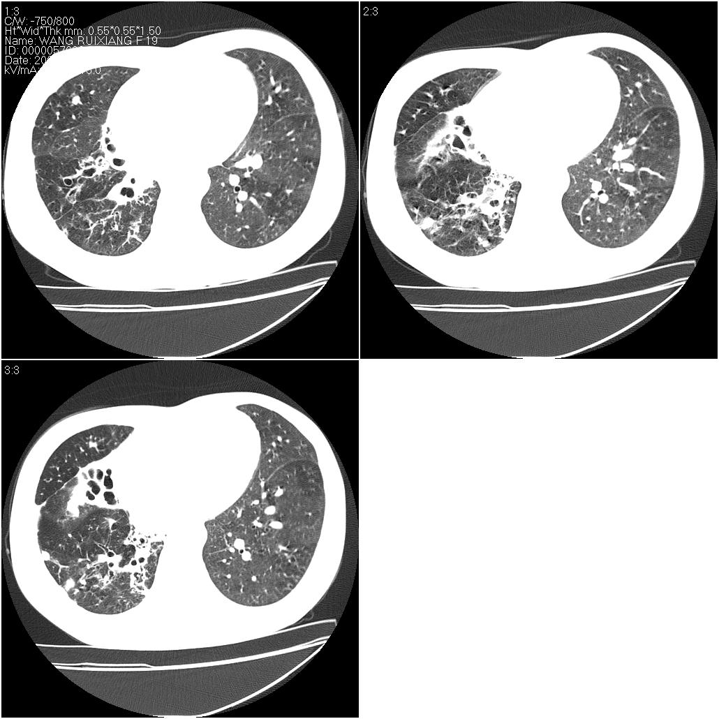 片子上的年龄为19岁,是操作错误。该患者于去年5月份曾做平片和ct扫描,和这一次的ct检查没有明显变化。当时诊断为肺结核,进行抗痨治疗至今,但没有改善。呼吸功能试验为混合型呼吸困难。除此之外,该患者没有其他方面没有的临床症状和体征