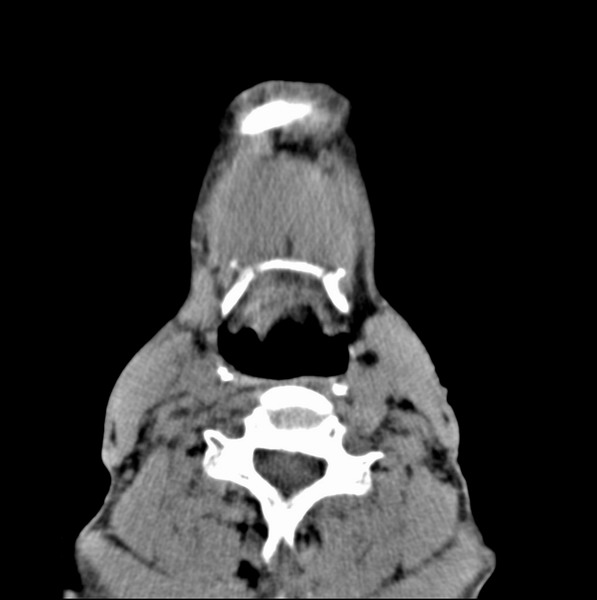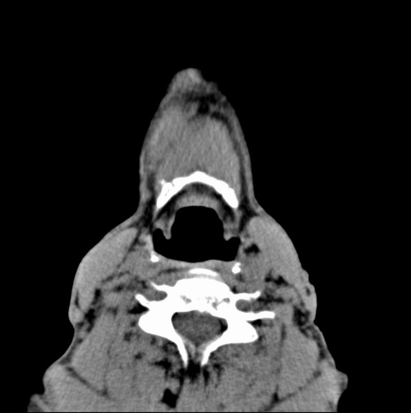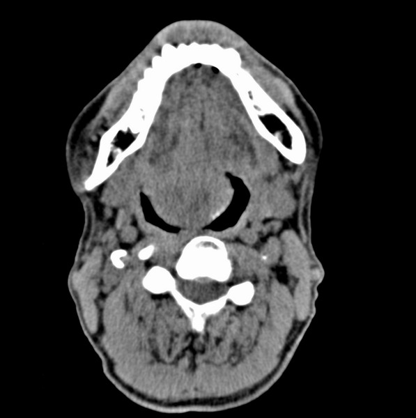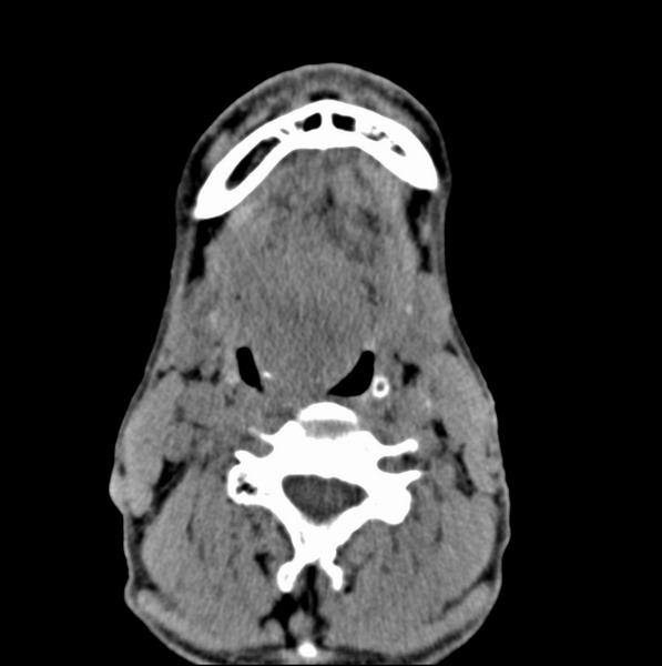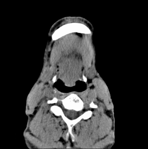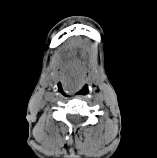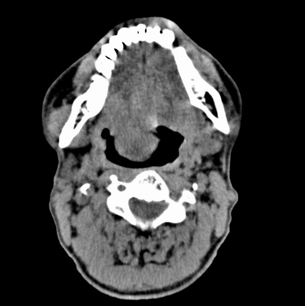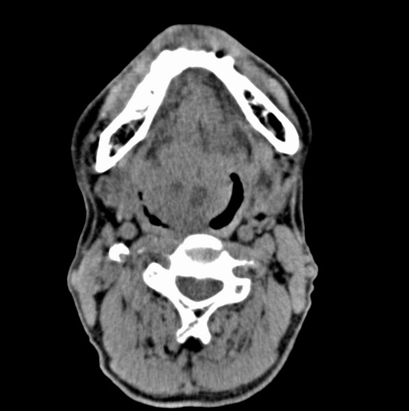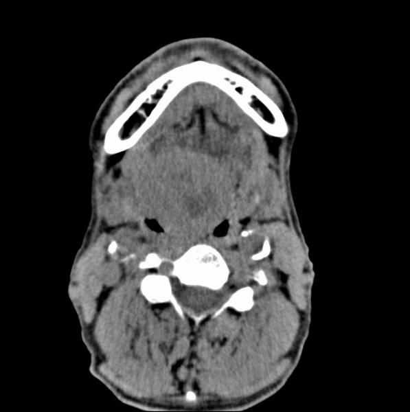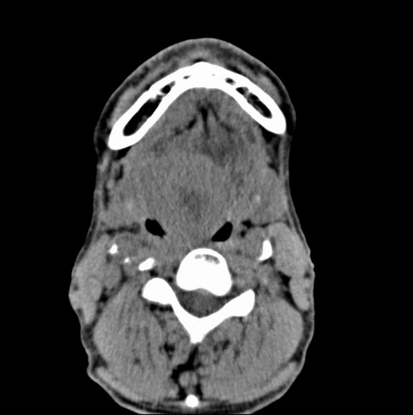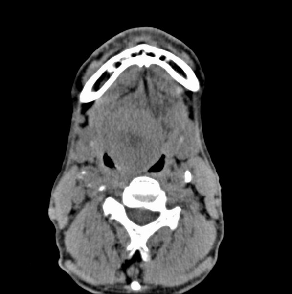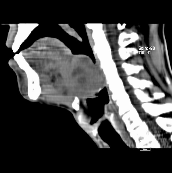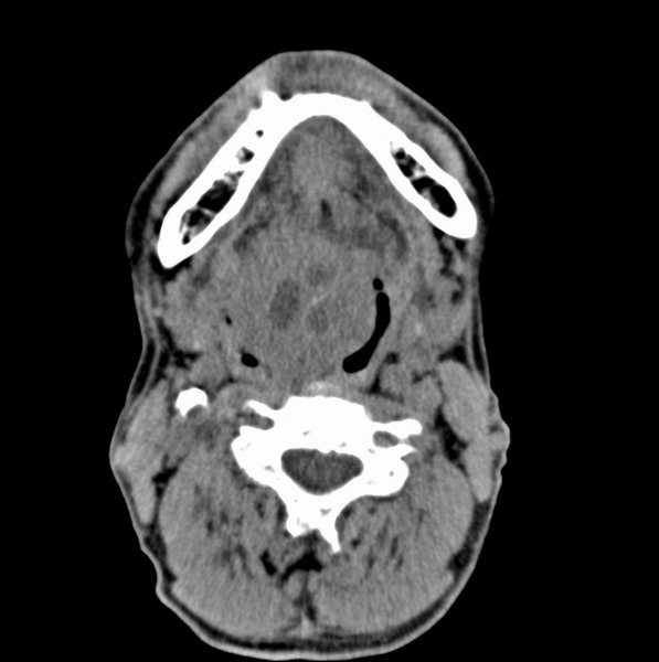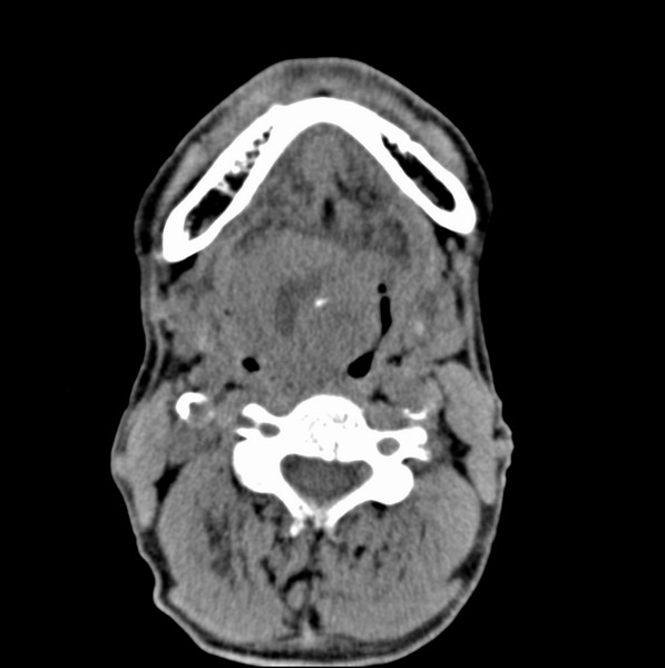 以下是引用随光逐影在2009-4-27 15:59:00的发言:[br]舌根部较大软组织肿块,其内见坏死低密度区及钙化影;考虑舌根癌可能。