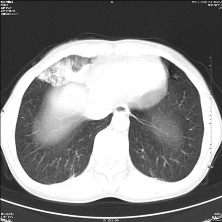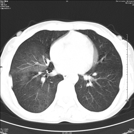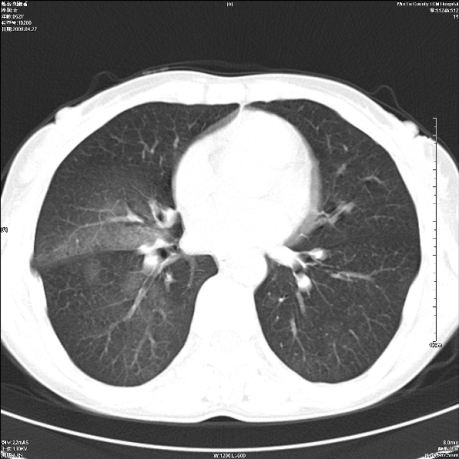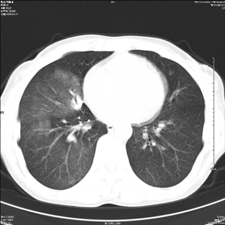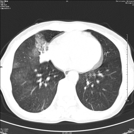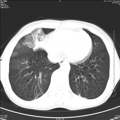 [br]考虑右肺中叶感染性病变并右肺中、下叶肺泡积血;建议抗炎、止血治疗后复查。