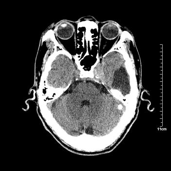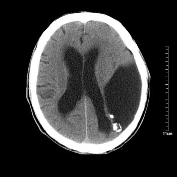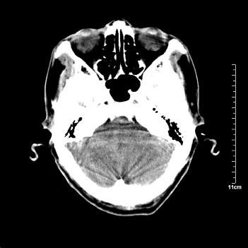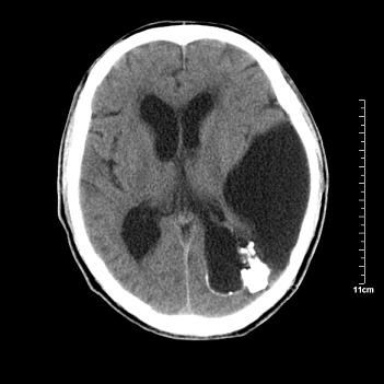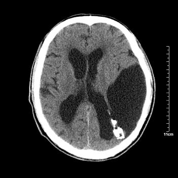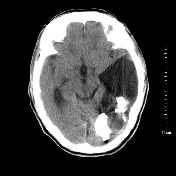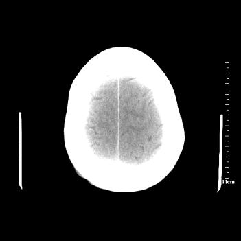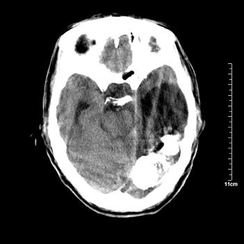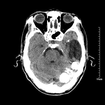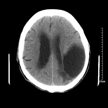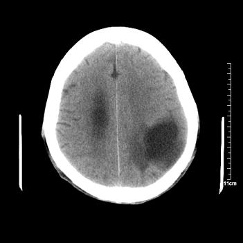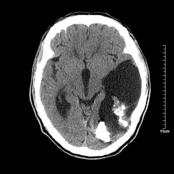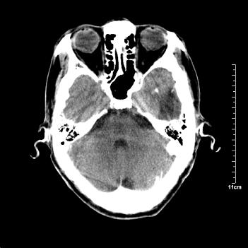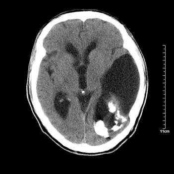 男性患者,72岁,近两天头晕来我院就诊。 因患者血压太高而未做增强,建议病人去市医院做mri检查。等得到mri随访结果再公布给大家。 测及左颞顶枕叶病灶ct值分别为5hu 30hu 729hu。