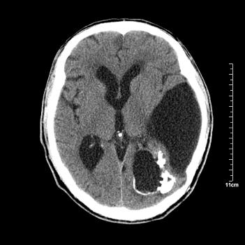 左侧颞顶枕叶大片状低密度影,呈均一水样密度,边界清楚,病灶边缘不规则片状钙化,左侧脑室后角扩大,中线结构未见移位,综合来看不像肿瘤,软化灶,钙化不好解释