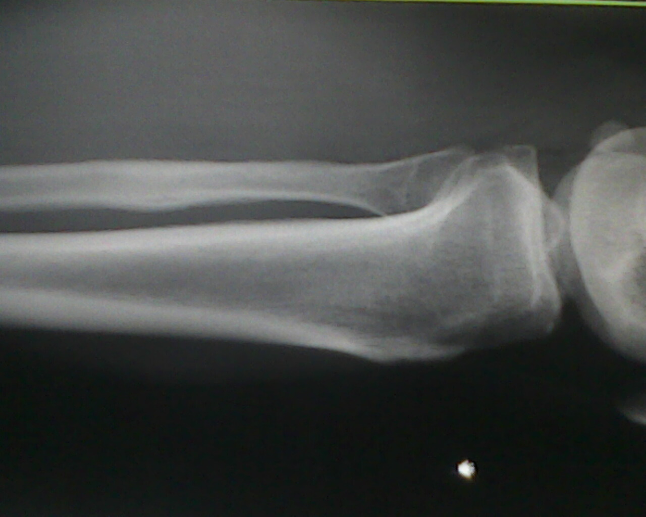 腓骨骨膜反应,骨质未见明显破坏,软组织肿胀。建议随访观察。