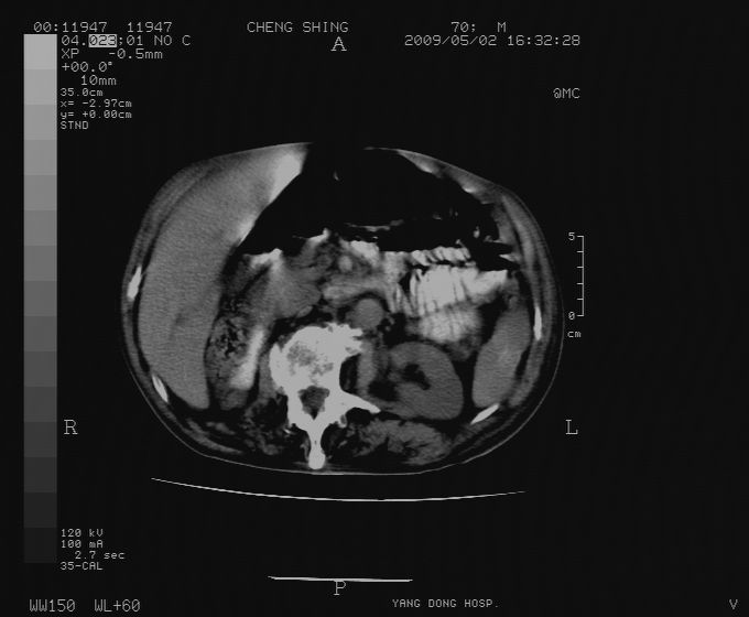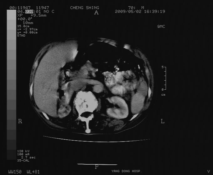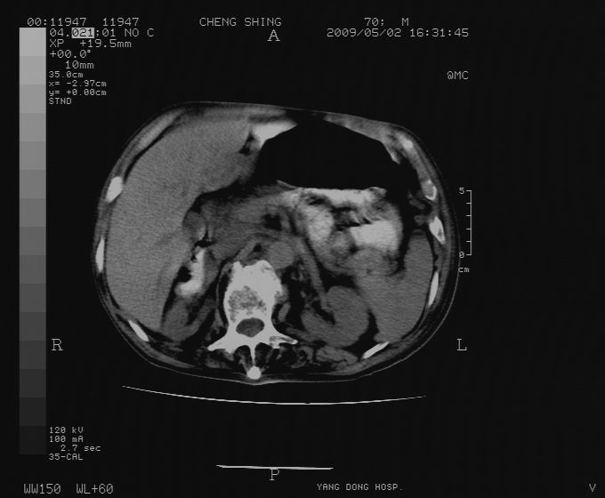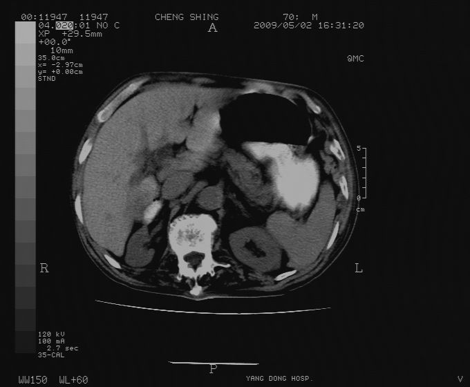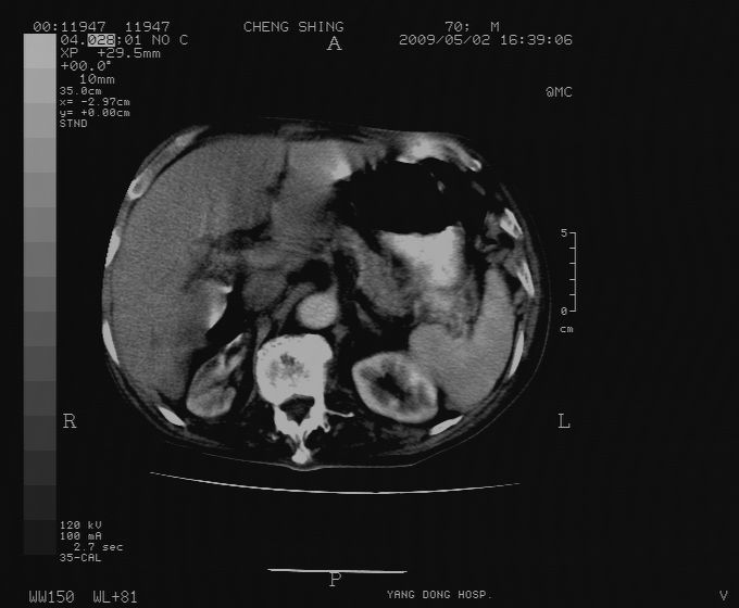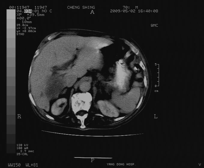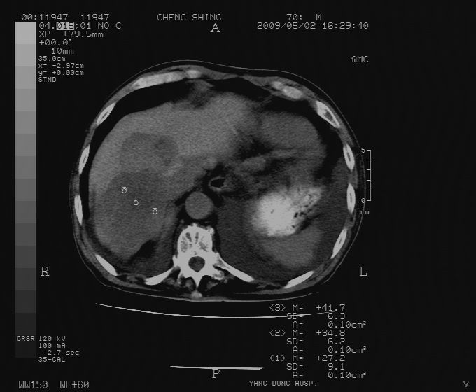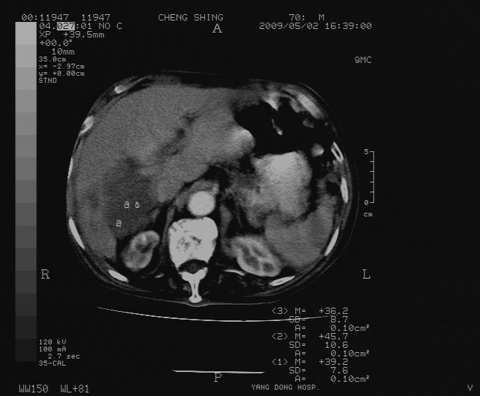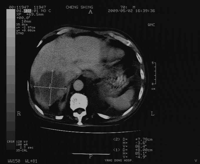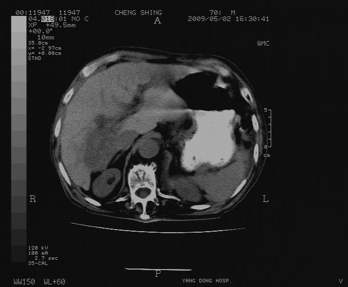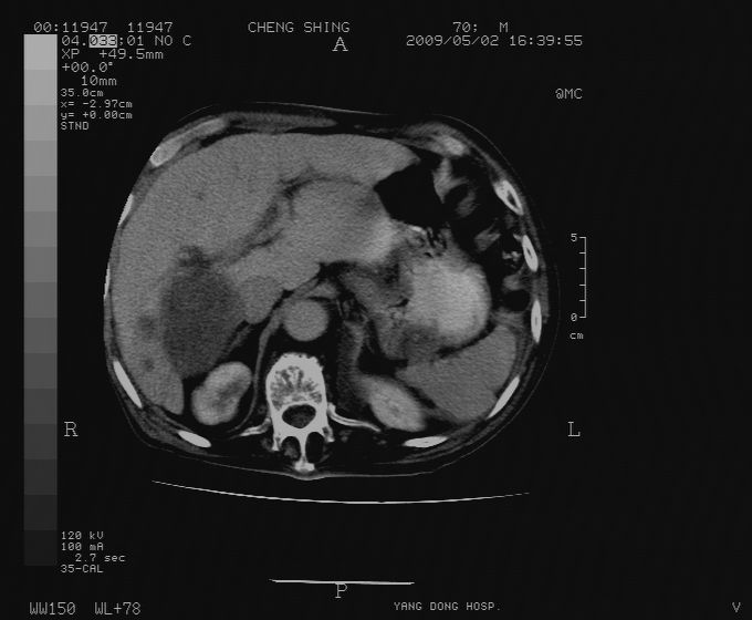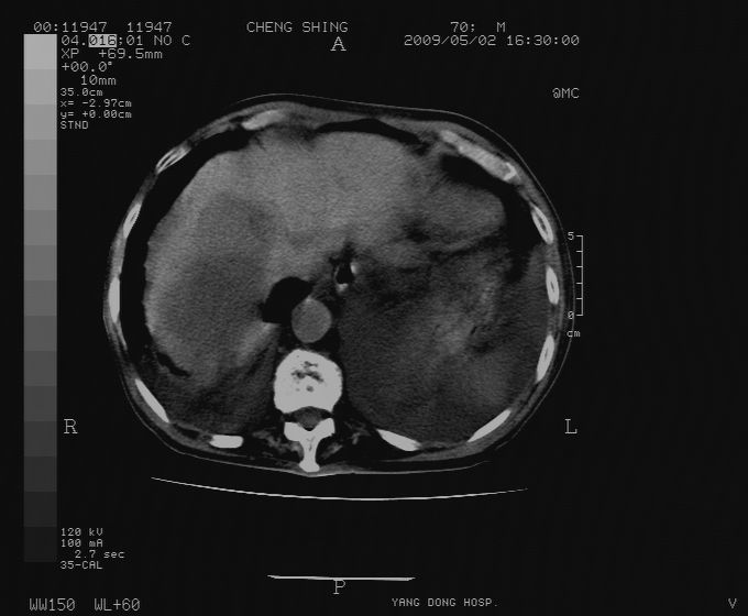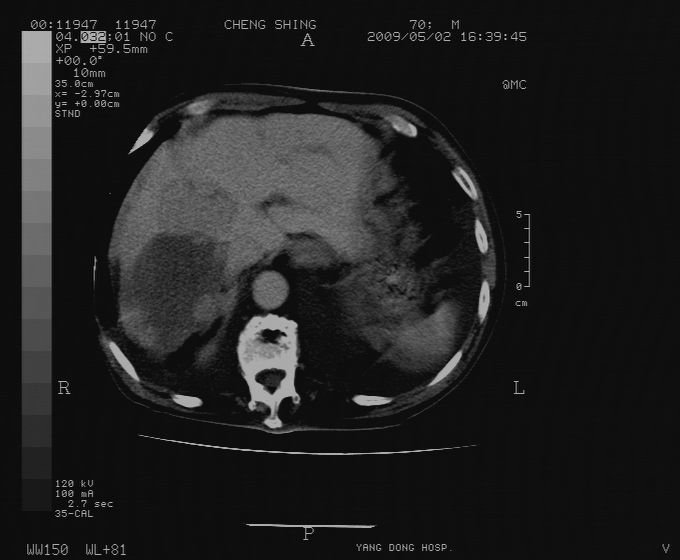CT19743:男70岁,肺部疾病入院,B超发现肝右叶占位,CT