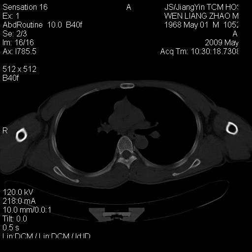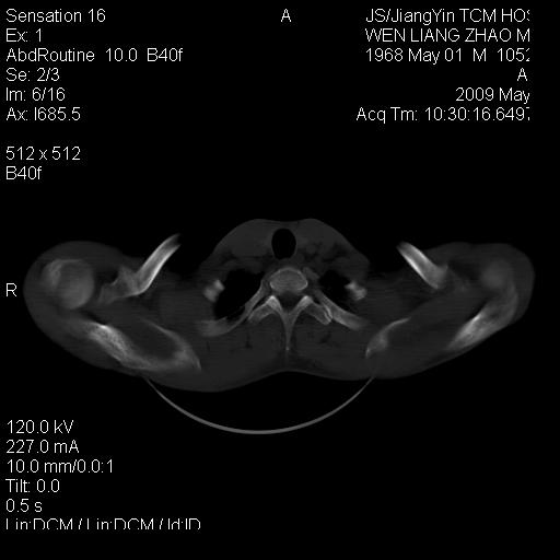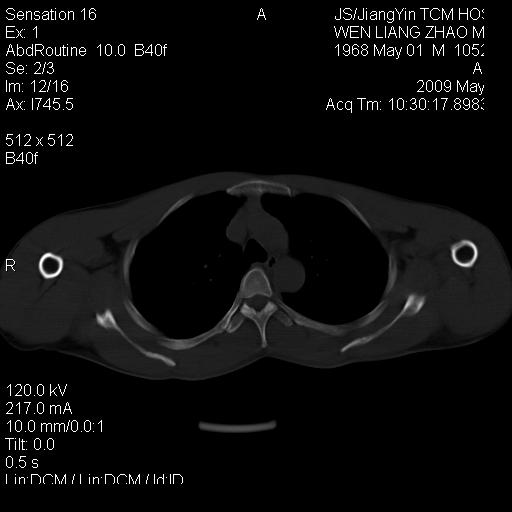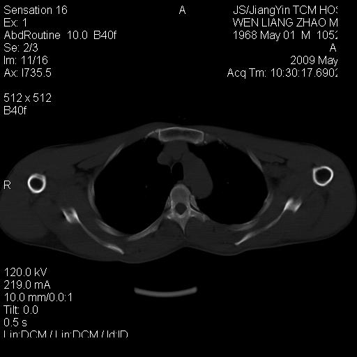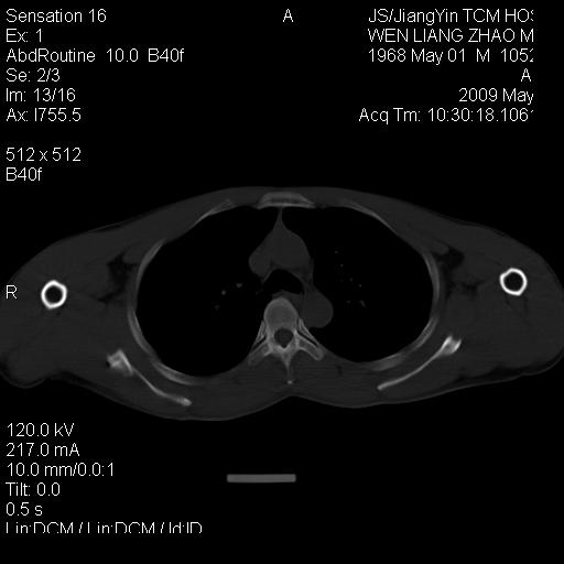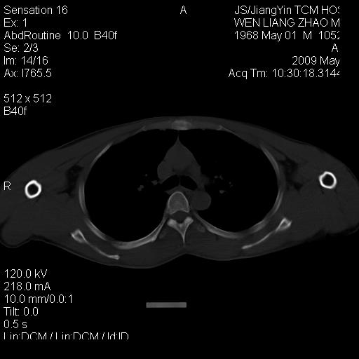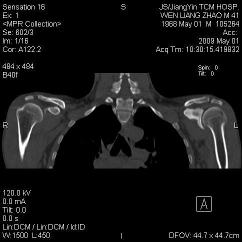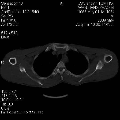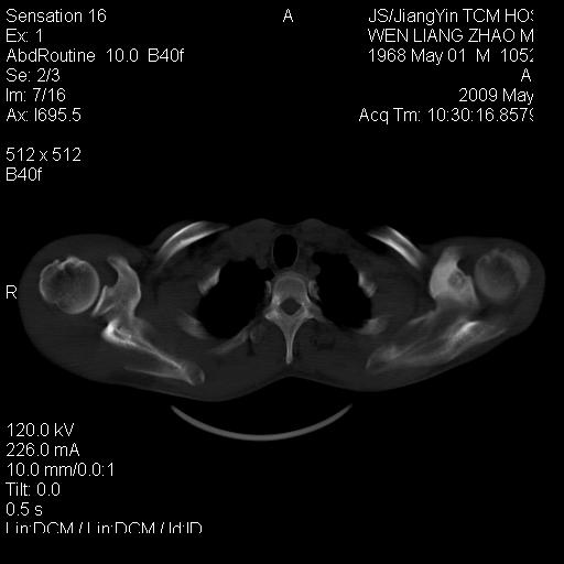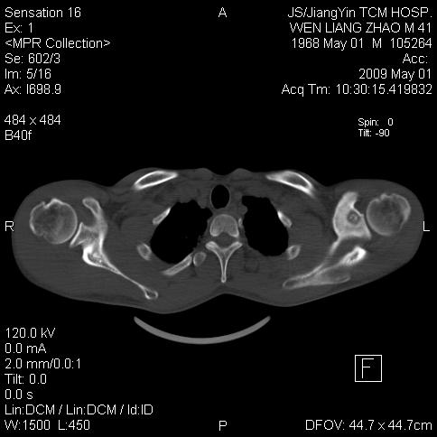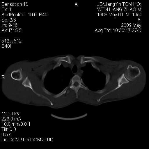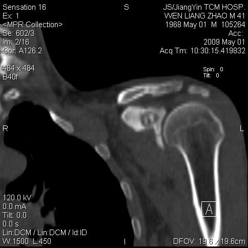 CT19762:左侧喙突处压痛二年。考虑骨样骨瘤。