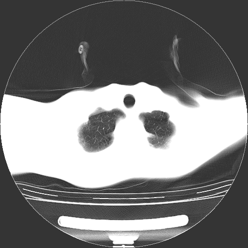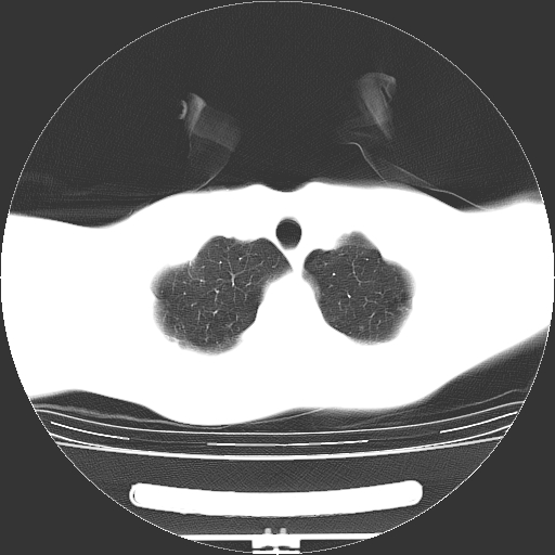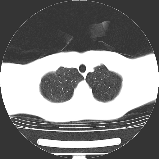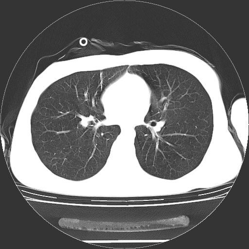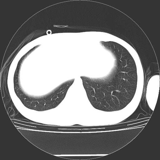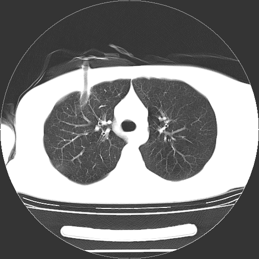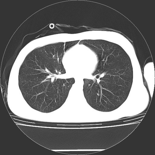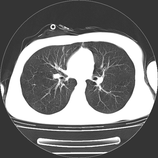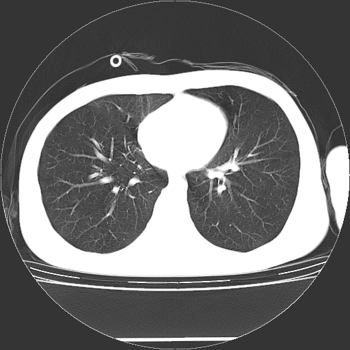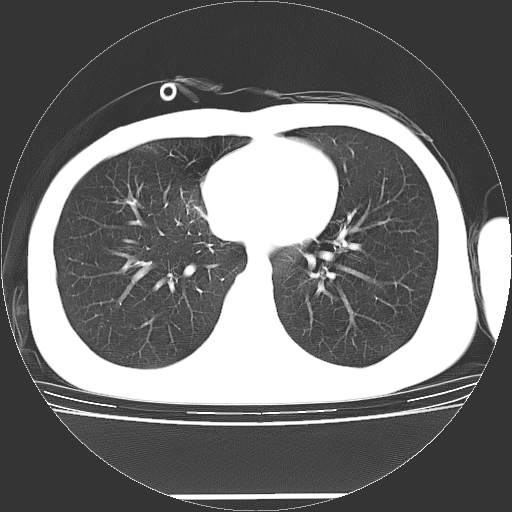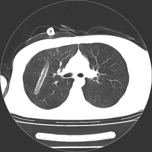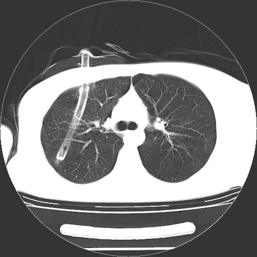 CT19767:男,20岁,右侧气胸行闭式引流术后五天CT检查。