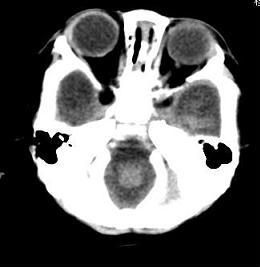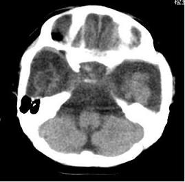 男,4个月大,2个月前无诱因下四肢抽搐、伴呕吐,近2天来抽搐频发,伴发热。查体:双眼疑视,神萎、纳差;颈抵抗,四肢张力高。