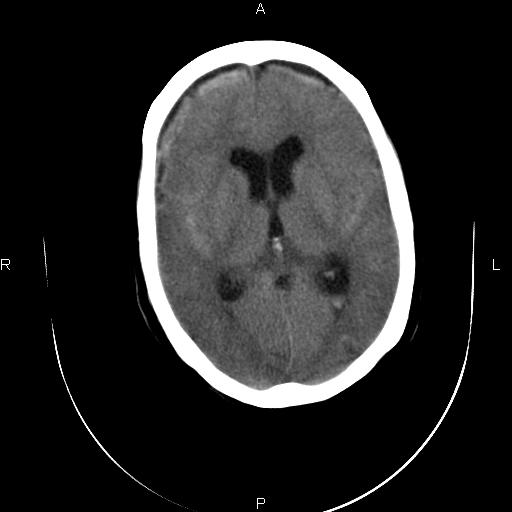 2、脑萎缩,双额叶颅板下低密度为增宽的蛛网膜下腔。