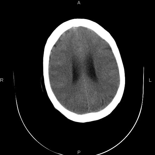 脑萎缩,双额叶颅板下低密度为增宽的蛛网膜下腔。