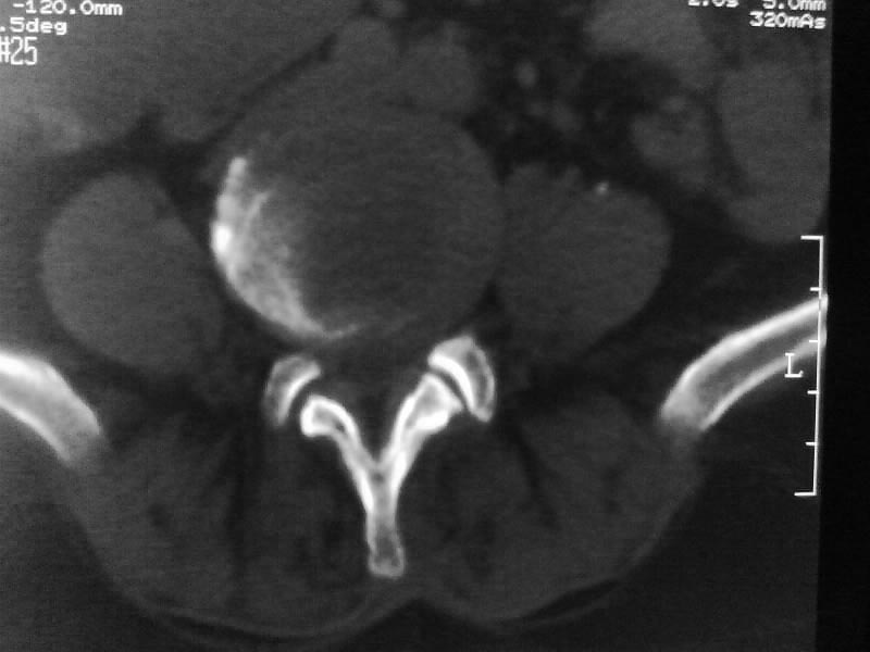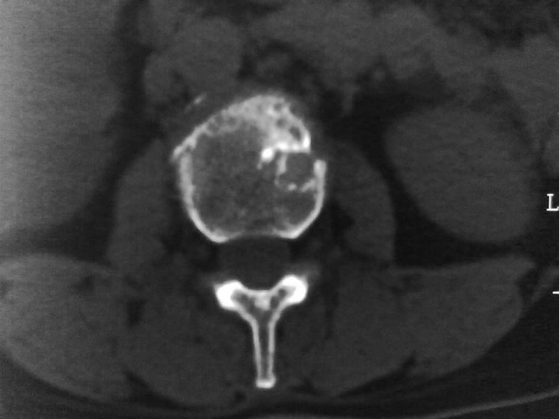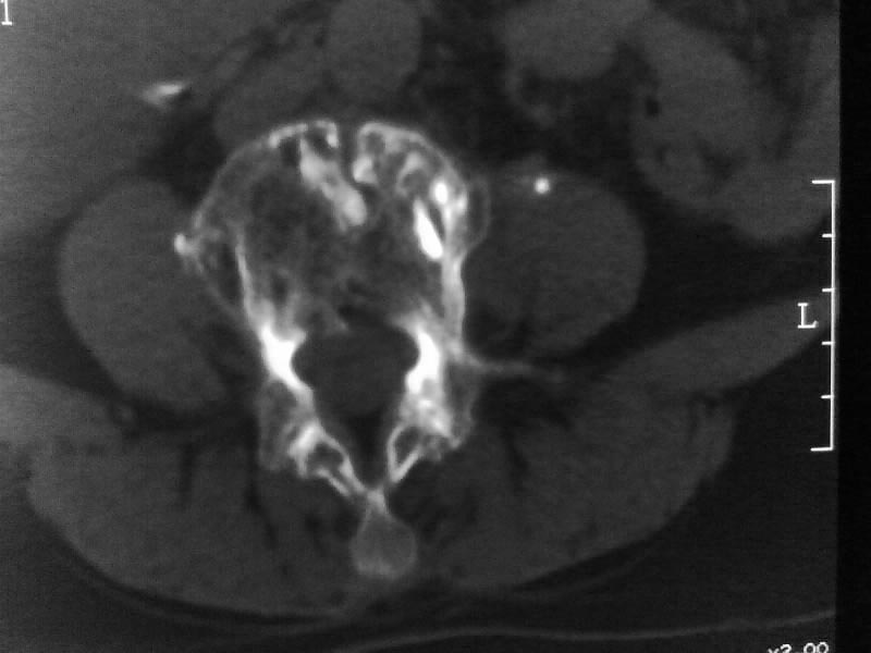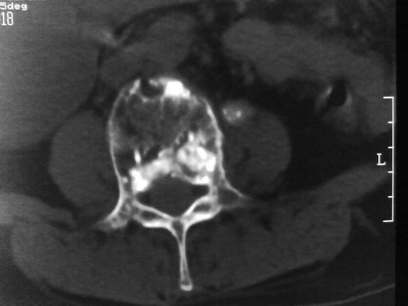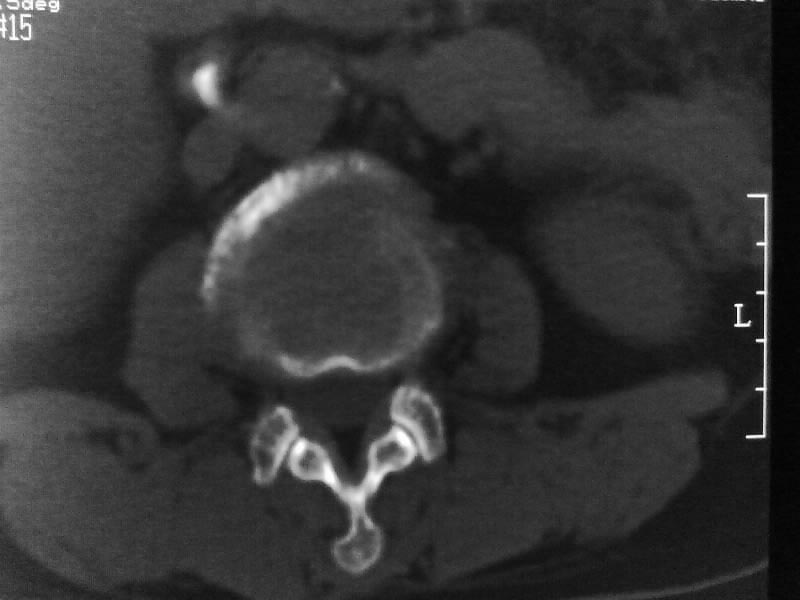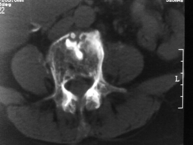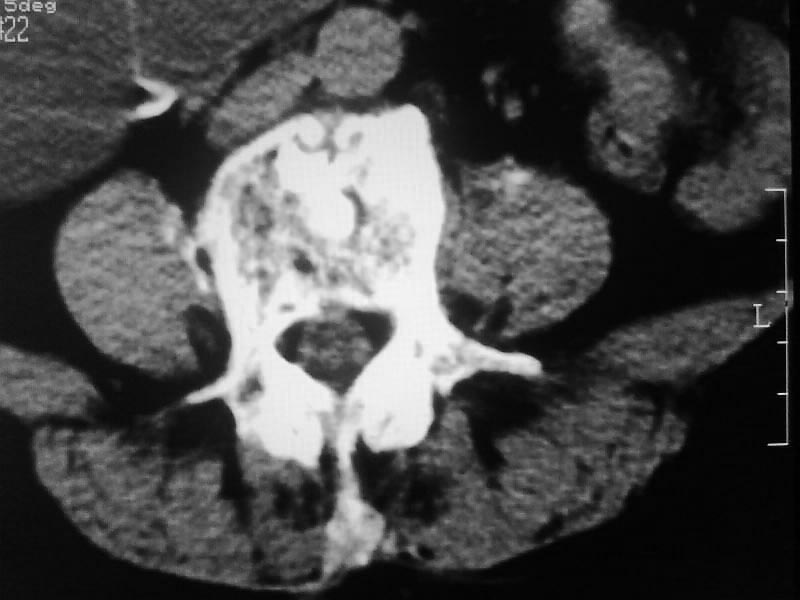 定位相示l2呈楔形改变(ct示陈旧性骨折改变,图像未传),l4.5椎体融合,以下是l4.5ct平扫.请各位看看,
