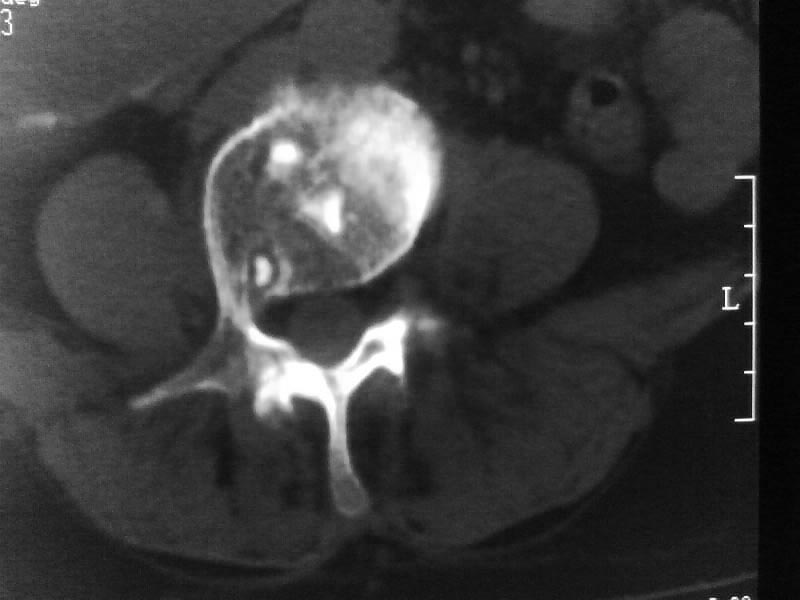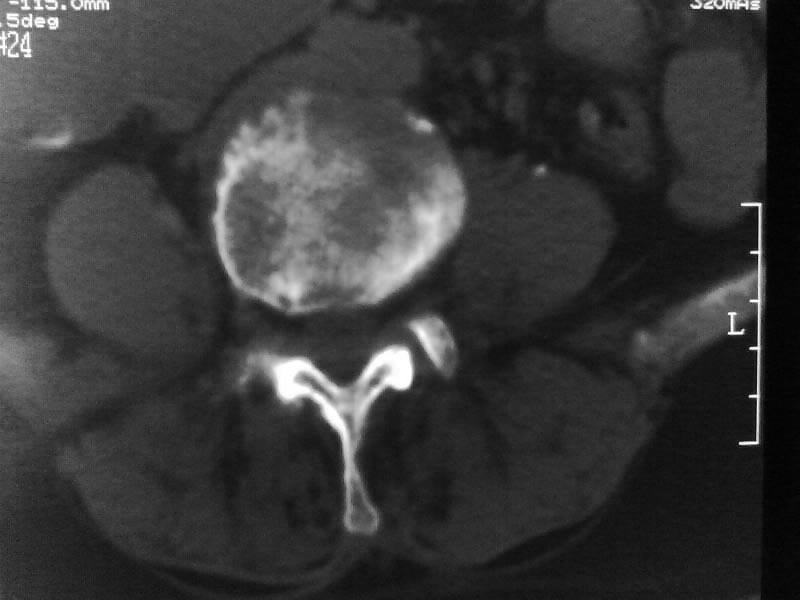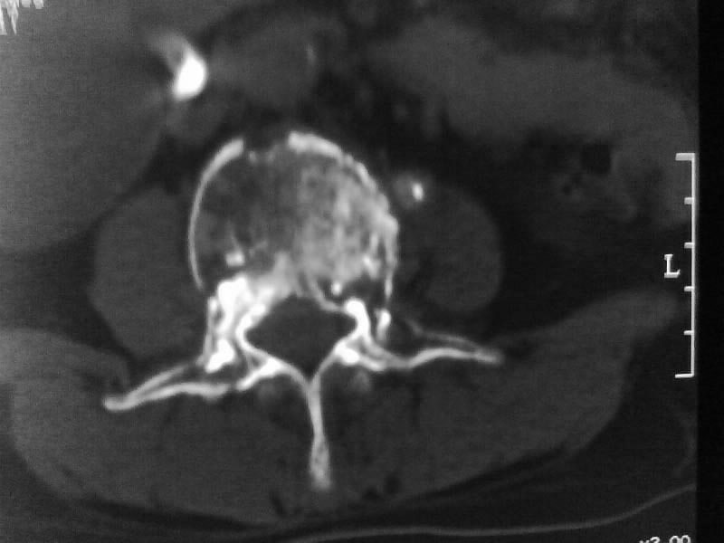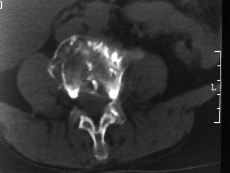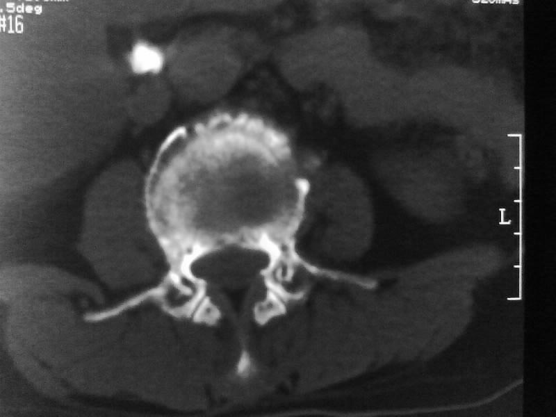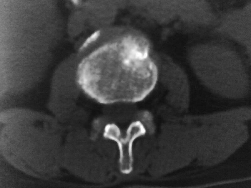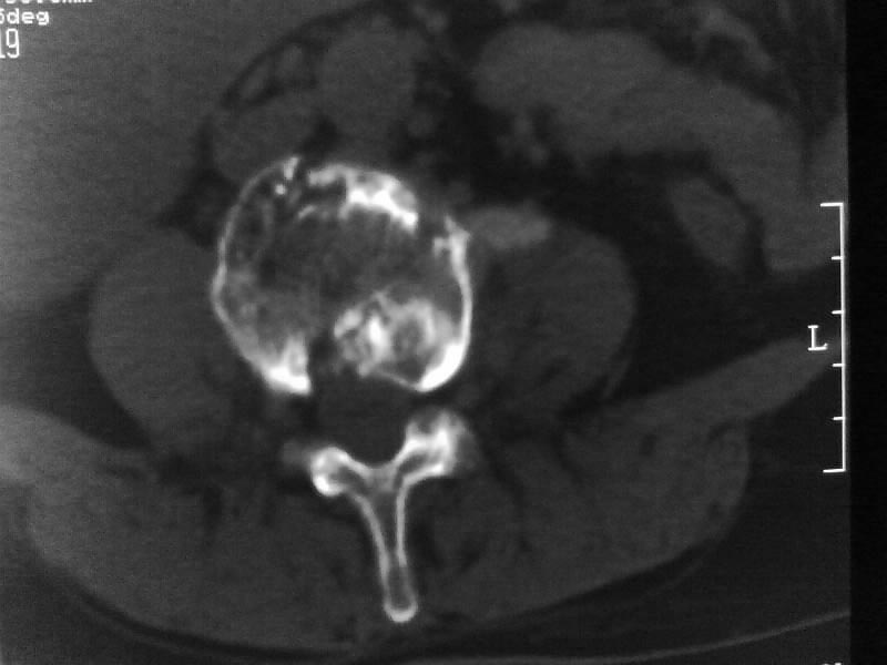 定位相示l2呈楔形改变(ct示陈旧性骨折改变,图像未传),l4.5椎体融合,以下是l4.5ct平扫.请各位看看,