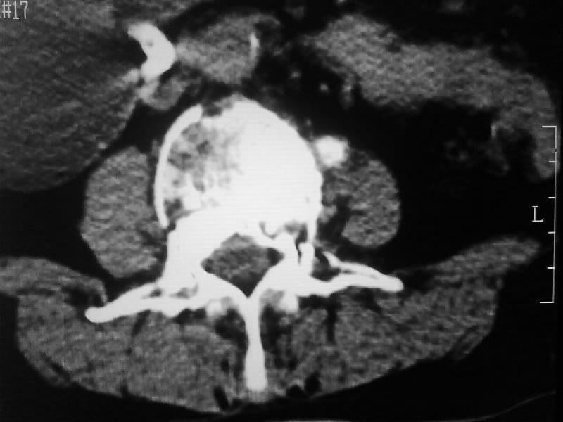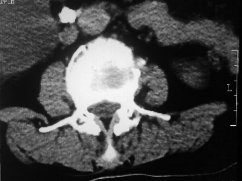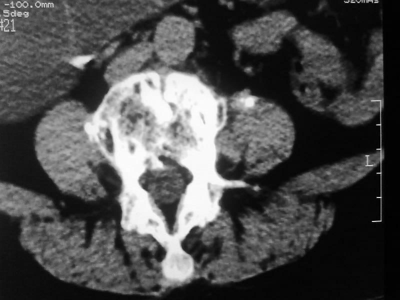 以下是引用yrj0513在2009-5-20 15:40:00的发言:[br]定位相示l2呈楔形改变(ct示陈旧性骨折改变,图像未传),l4.5椎体融合,以下是l4.5ct平扫.请各位看看,