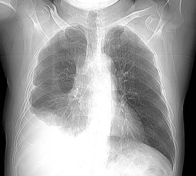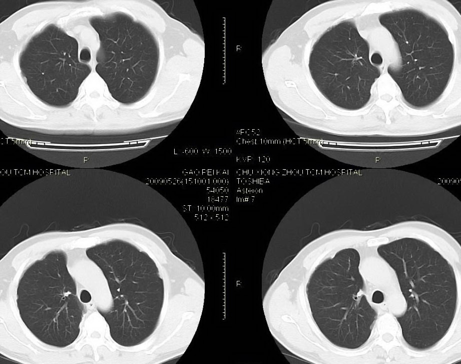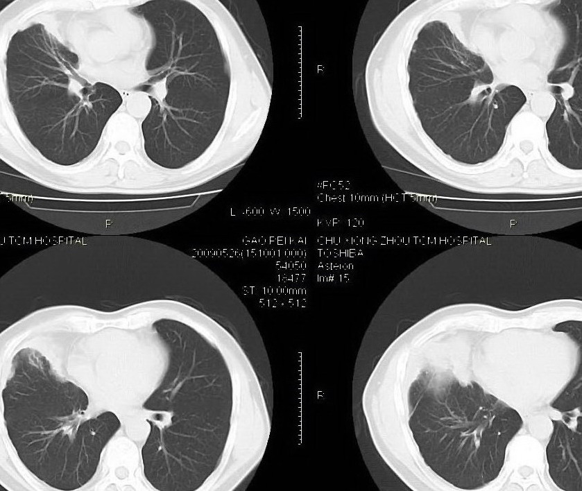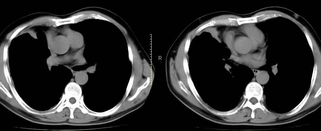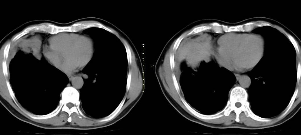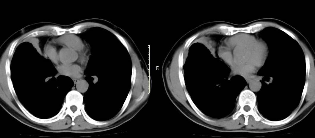 以下是引用随光逐影在2009-5-27 15:14:00的发言:[br]1)右肺中叶节段性肺不张。2)右肺中叶肺癌不排除。3)右侧胸膜增厚。