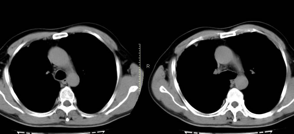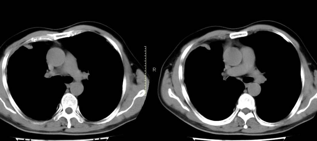 右侧腋窝下巨大软组织包块已经被切除后的ct片,该病例有多家医院较多的ct检查片。