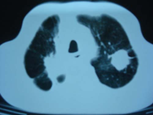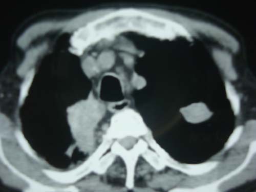 男性,45岁,胸疼,低热,抗炎治疗后症状缓解拍片检查发现左上肺有高密度灶,考虑结核,做ct示条件有限采集了部分图像,图像质量差请谅解