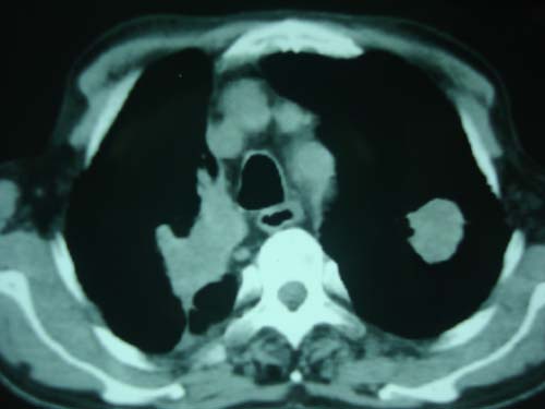 右上肺结核,左上肺周围型肺癌可能性大