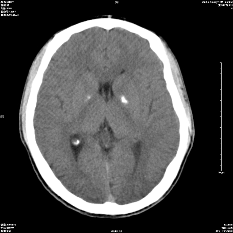 以下是引用zxl51642在2009-6-23 14:15:00的发言:[br]1、颅内未见血肿,颅骨未见骨折;[br]2、双侧苍白球对称性钙化,透明隔间腔及verga氏腔形成。