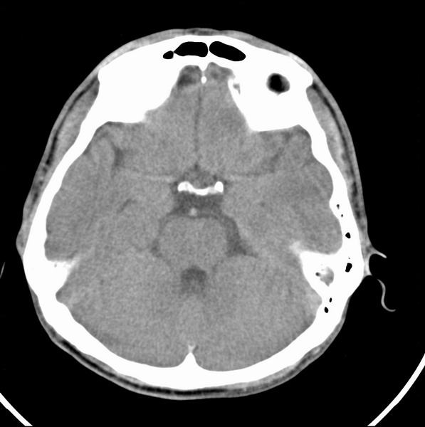 右侧额叶低密度影,边界清晰,无占位效应,符合:额叶皮质脑软化灶。