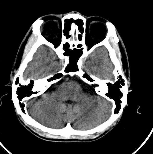 考虑右侧额叶脑软化灶;建议必要时行mri检查排除其他。