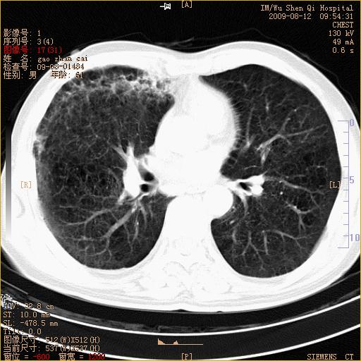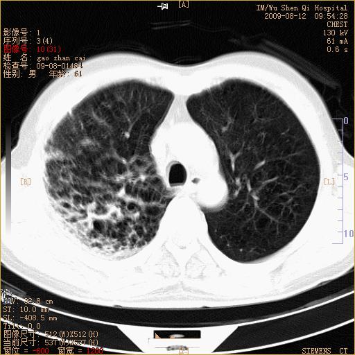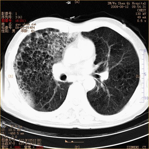 我也遇上类似病例,先是考虑间质性肺炎,经抗炎治疗一月无效,随后临床考虑结核,又抗痨治疗两月,还是无效。病人己死亡。