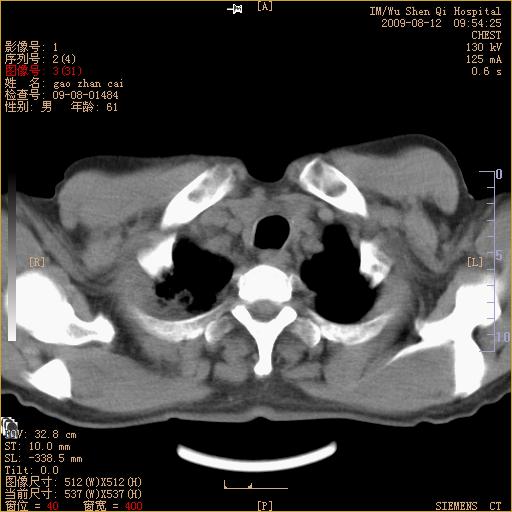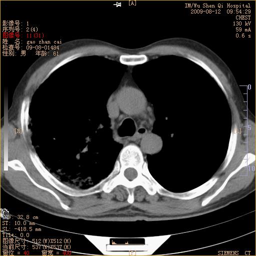 1、右上肺继发性肺结核合并感染;2、肺气肿。
