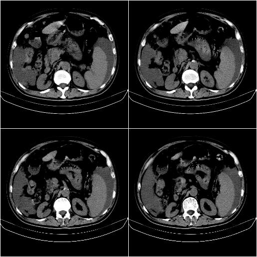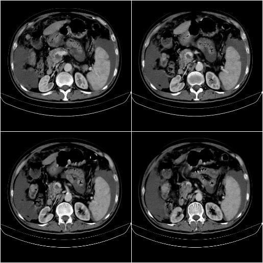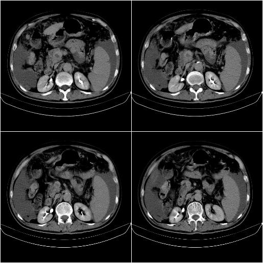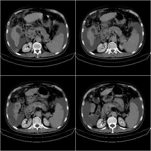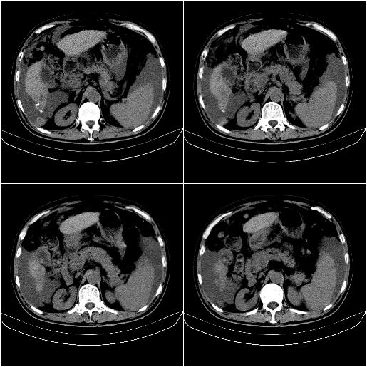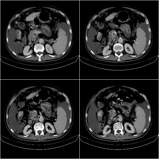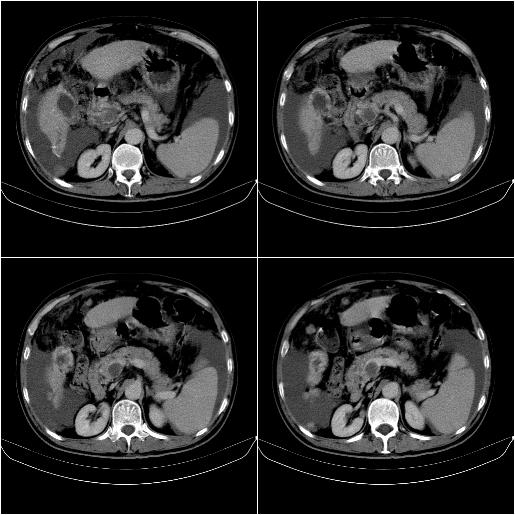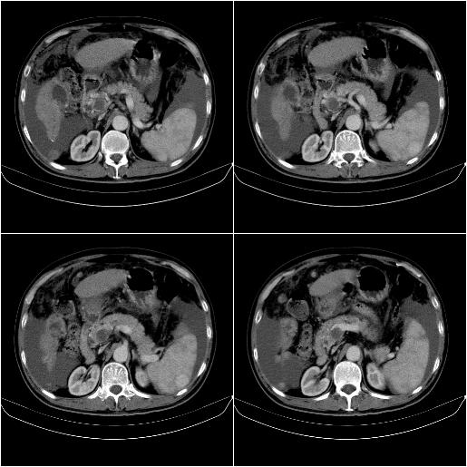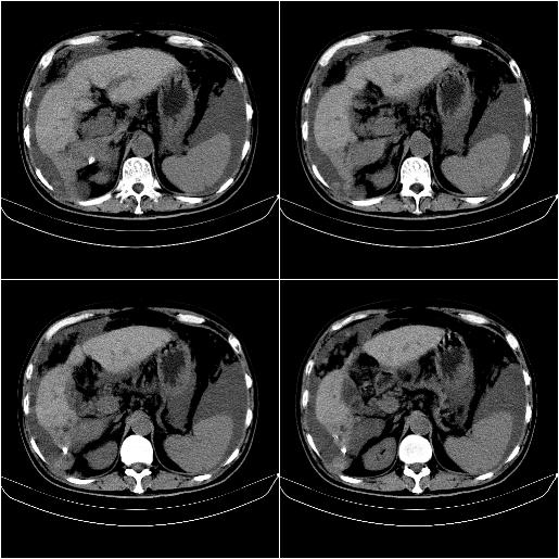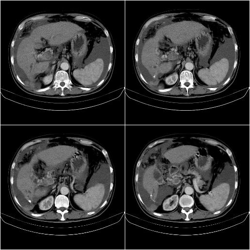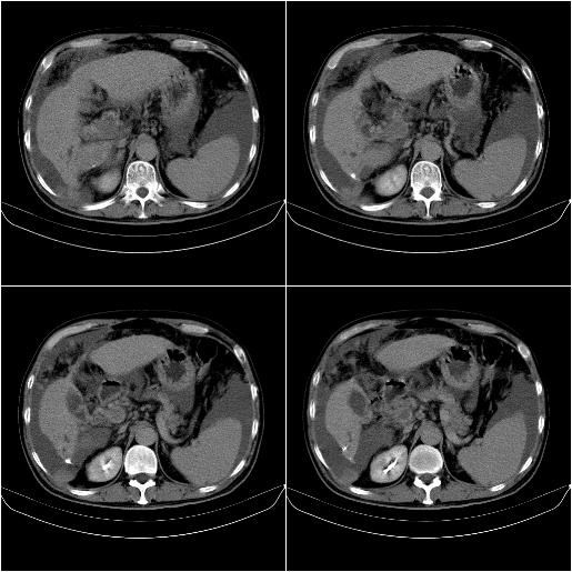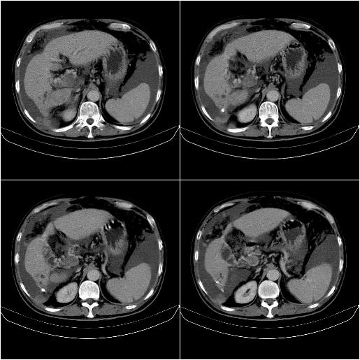 [br]1)肝癌介入治疗术后碘油沉积不良。2)门静脉瘤栓形成,腹膜广泛性转移。3)肝硬化,脾大,腹水。4)慢性胆囊炎。