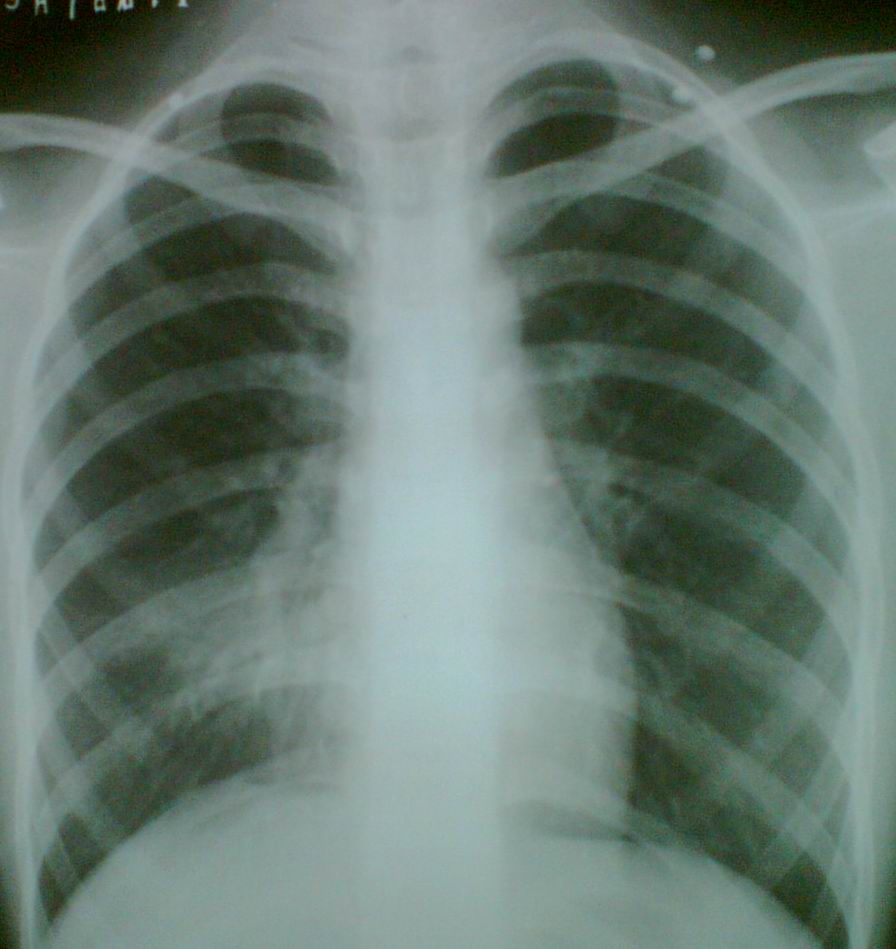 以下是引用sunbin在2009-9-8 17:04:00的发言:[br]右肺中叶实变,建议加照右侧位片。或ct检查。